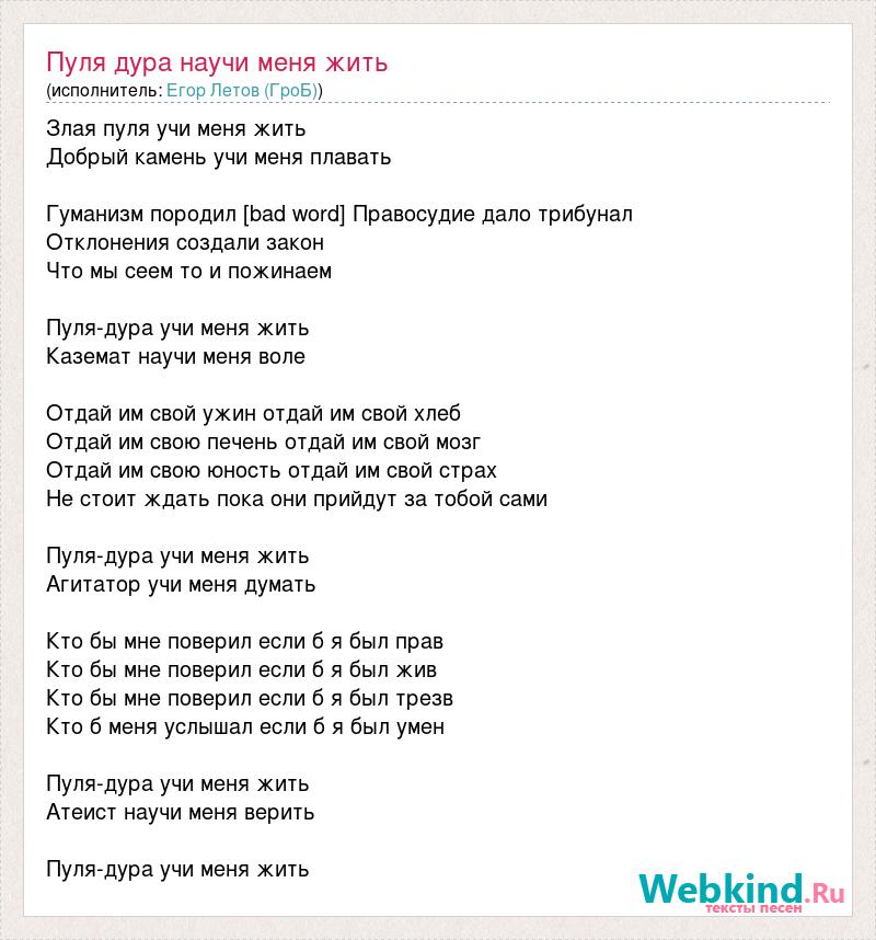 Злая пуля учи меня жить Добрый камень учи меня плавать Гуманизм породил [bad word] Правосудие дало трибунал Отклонения создали закон Что мы сеем то и пожинаем Пуля-дура учи меня жить Каземат научи меня воле Отдай им свой ужин отдай им свой хлеб Отдай им свою печень отдай им свой мозг Отдай им свою юность отдай им свой страх Не стоит ждать пока они прийдут за тобой сами Пуля-дура учи меня жить Агитатор учи меня думать Кто бы мне поверил если б я был прав Кто бы мне поверил если б я был жив Кто бы мне поверил если б я был трезв Кто б меня услышал если б я был умен Пуля-дура учи меня жить Атеист научи меня верить Пуля-дура учи меня жить