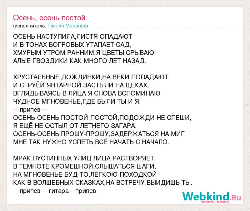 ОСЕНЬ НАСТУПИЛА,ЛИСТЯ ОПАДАЮТ И В ТОНАХ БОГРОВЫХ УТАПАЕТ САД, ХМУРЫМ УТРОМ РАННИМ,Я ЦВЕТЫ СРЫВАЮ АЛЫЕ ГВОЗДИКИ КАК МНОГО ЛЕТ НАЗАД. ХРУСТАЛЬНЫЕ ДОЖДИНКИ,НА ВЕКИ ПОПАДАЮТ И СТРУЁЙ ЯНТАРНОЙ ЗАСТЫЛИ НА ЩЕКАХ, ВГЛЯДЫВАЯСЬ В ЛИЦА Я СНОВА ВСПОМИНАЮ ЧУДНОЕ МГНОВЕНЬЕ,ГДЕ БЫЛИ ТЫ И Я. ---припев--- ОСЕНЬ-ОСЕНЬ ПОСТОЙ-ПОСТОЙ,ПОДОЖДИ НЕ СПЕШИ, Я ЕЩЁ НЕ ОСТЫЛ ОТ ЛЕТНЕГО ЗАГАРА, ОСЕНЬ-ОСЕНЬ ПРОШУ-ПРОШУ,ЗАДЕРЖАТЬСЯ НА МИГ МНЕ ТАК НУЖНО УСПЕТЬ,ВСЁ НАЧАТЬ С НАЧАЛО. МРАК ПУСТИННЫХ УЛИЦ ЛИЦА РАСТВОРЯЕТ, В ТЕМНОТЕ КРОМЕШНОЙ,СЛЫШАТЬСЯ ШАГИ, НА МГНОВЕНЬЕ БУД-ТО,ЛЁГКОЮ ПОХОДКОЙ КАК В ВОЛШЕБНЫХ СКАЗКАХ,НА ВСТРЕЧУ ВЫИДИШЬ ТЫ. ---припев--- гитара---припев---