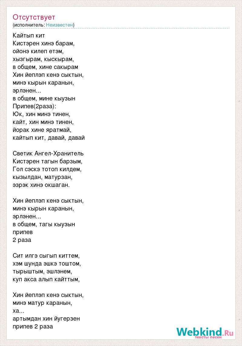 Кайтып кит Кистэрен хинэ барам, ойонэ килеп етэм, хызгырам, кыскырам, в общем, хине сакырам Хин йеплэп кенэ сыктын, минэ кырын каранын, эрлэнен... в общем, мине кыузын Припев(2раза): Юк, хин минэ тинен, кайт, хин минэ тинен, йорак хине яратмай, кайтып кит, давай, давай Светик Ангел-Хранитель Кистэрен тагын барзым, Гол сэскэ тотоп килдем, кызылдан, матурзан, эзрэк хинэ окшаган. Хин йеплэп кенэ сыктын, минэ кырын каранын, эрлэнен... в общем, тагы кыузын припев 2 раза Сит илгэ сыгып киттем, хэм шунда эшкэ тоштом, тырыштым, эшлэнем, куп акса алып кайттым, Хин йеплэп кенэ сыктын, минэ матур каранын, ха... артымдан хин йугерзен припев 2 раза