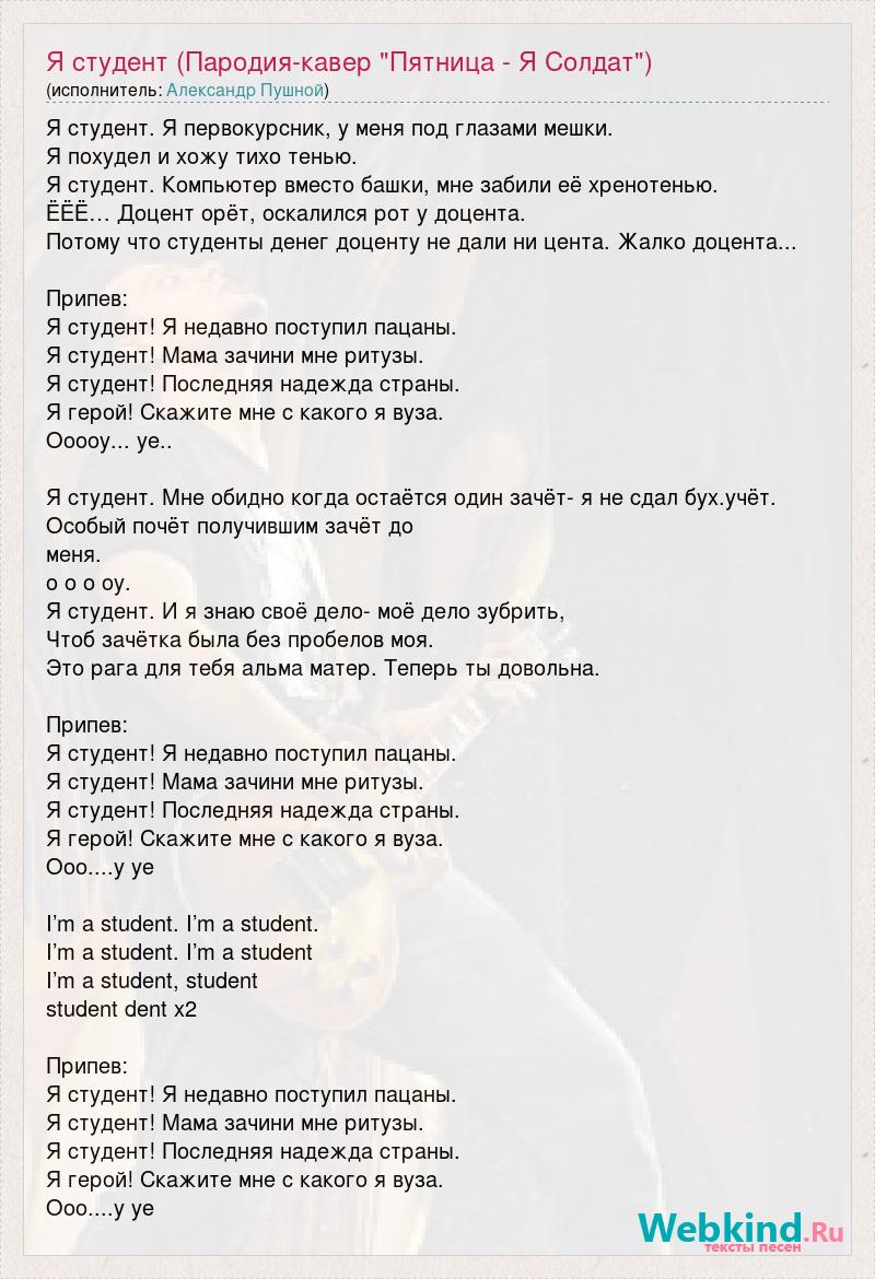 Я студент. Я первокурсник, у меня под глазами мешки. Я похудел и хожу тихо тенью. Я студент. Компьютер вместо башки, мне забили её хренотенью. ЁЁЁ… Доцент орёт, оскалился рот у доцента. Потому что студенты денег доценту не дали ни цента. Жалко доцента... Припев: Я студент! Я недавно поступил пацаны. Я студент! Мама зачини мне ритузы. Я студент! Последняя надежда страны. Я герой! Скажите мне с какого я вуза. Ооооу... уе.. Я студент. Мне обидно когда остаётся один зачёт- я не сдал бух.учёт. Особый почёт получившим зачёт до меня. о о о оу. Я студент. И я знаю своё дело- моё дело зубрить, Чтоб зачётка была без пробелов моя. Это рага для тебя альма матер. Теперь ты довольна. Припев: Я студент! Я недавно поступил пацаны. Я студент! Мама зачини мне ритузы. Я студент! Последняя надежда страны. Я герой! Скажите мне с какого я вуза. Ооо....у уе I’m a student. I’m a student. I’m a student. I’m a student I’m a student, student student dent х2 Припев: Я студент! Я недавно поступил пацаны. Я студент! Мама зачини мне ритузы. Я студент! Последняя надежда страны. Я герой! Скажите мне с какого я вуза. Ооо....у уе
