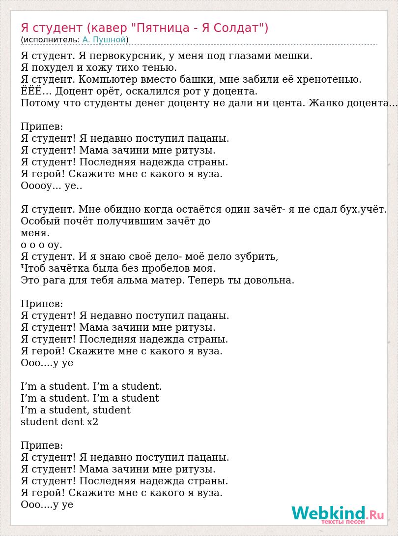 Я студент. Я первокурсник, у меня под глазами мешки. Я похудел и хожу тихо тенью. Я студент. Компьютер вместо башки, мне забили её хренотенью. ЁЁЁ… Доцент орёт, оскалился рот у доцента. Потому что студенты денег доценту не дали ни цента. Жалко доцента... Припев: Я студент! Я недавно поступил пацаны. Я студент! Мама зачини мне ритузы. Я студент! Последняя надежда страны. Я герой! Скажите мне с какого я вуза. Ооооу... уе.. Я студент. Мне обидно когда остаётся один зачёт- я не сдал бух.учёт. Особый почёт получившим зачёт до меня. о о о оу. Я студент. И я знаю своё дело- моё дело зубрить, Чтоб зачётка была без пробелов моя. Это рага для тебя альма матер. Теперь ты довольна. Припев: Я студент! Я недавно поступил пацаны. Я студент! Мама зачини мне ритузы. Я студент! Последняя надежда страны. Я герой! Скажите мне с какого я вуза. Ооо....у уе I’m a student. I’m a student. I’m a student. I’m a student I’m a student, student student dent х2 Припев: Я студент! Я недавно поступил пацаны. Я студент! Мама зачини мне ритузы. Я студент! Последняя надежда страны. Я герой! Скажите мне с какого я вуза. Ооо....у уе