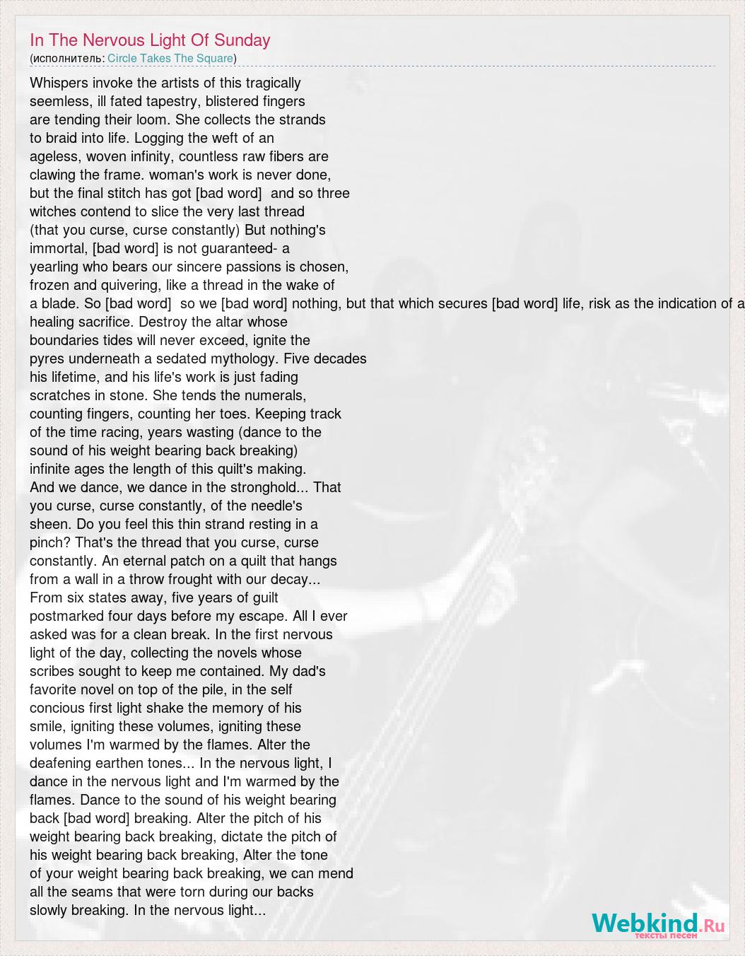 Whispers invoke the artists of this tragically seemless, ill fated tapestry, blistered fingers are tending their loom. She collects the strands to braid into life. Logging the weft of an ageless, woven infinity, countless raw fibers are clawing the frame. woman's work is never done, but the final stitch has got [bad word] and so three witches contend to slice the very last thread (that you curse, curse constantly) But nothing's immortal, [bad word] is not guaranteed- a yearling who bears our sincere passions is chosen, frozen and quivering, like a thread in the wake of a blade. So [bad word] so we [bad word] nothing, but that which secures [bad word] life, risk as the indication of a healing sacrifice. Destroy the altar whose boundaries tides will never exceed, ignite the pyres underneath a sedated mythology. Five decades his lifetime, and his life's work is just fading scratches in stone. She tends the numerals, counting fingers, counting her toes. Keeping track of the time racing, years wasting (dance to the sound of his weight bearing back breaking) infinite ages the length of this quilt's making. And we dance, we dance in the stronghold... That you curse, curse constantly, of the needle's sheen. Do you feel this thin strand resting in a pinch? That's the thread that you curse, curse constantly. An eternal patch on a quilt that hangs from a wall in a throw frought with our decay... From six states away, five years of guilt postmarked four days before my escape. All I ever asked was for a clean break. In the first nervous light of the day, collecting the novels whose scribes sought to keep me contained. My dad's favorite novel on top of the pile, in the self concious first light shake the memory of his smile, igniting these volumes, igniting these volumes I'm warmed by the flames. Alter the deafening earthen tones... In the nervous light, I dance in the nervous light and I'm warmed by the flames. Dance to the sound of his weight bearing back [bad word] breaking. Alter the pitch of his weight bearing back breaking, dictate the pitch of his weight bearing back breaking, Alter the tone of your weight bearing back breaking, we can mend all the seams that were torn during our backs slowly breaking. In the nervous light...
