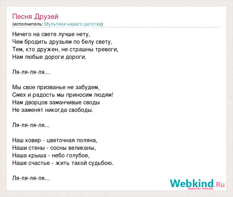 Ничего на свете лучше нету, Чем бродить друзьям по белу свету, Тем, кто дружен, не страшны тревоги, Нам любые дороги дороги. Ля-ля-ля-ля... Мы свое призванье не забудем, Смех и радость мы приносим людям! Нам дворцов заманчивые своды Не заменят никогда свободы. Ля-ля-ля-ля... Наш ковер - цветочная поляна, Наши стены - сосны великаны, Наша крыша - небо голубое, Наше счастье - жить такой судьбою. Ля-ля-ля-ля...