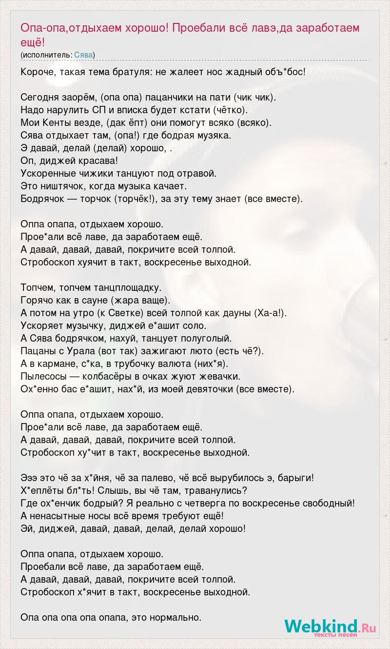 Короче, такая тема братуля: не жалеет нос жадный объ*бос! Сегодня заорём, (опа опа) пацанчики на пати (чик чик). Надо нарулить СП и вписка будет кстати (чётко). Мои Кенты везде, (дак ёпт) они помогут всяко (всяко). Сява отдыхает там, (опа!) где бодрая музяка. Э давай, делай (делай) хорошо, . Оп, диджей красава! Ускоренные чижики танцуют под отравой. Это ништячок, когда музыка качает. Бодрячок — торчок (торчёк!), за эту тему знает (все вместе). Оппа опапа, отдыхаем хорошо. Прое*али всё лаве, да заработаем ещё. А давай, давай, давай, покричите всей толпой. Стробоскоп хуячит в такт, воскресенье выходной. Топчем, топчем танцплощадку. Горячо как в сауне (жара ваще). А потом на утро (к Светке) всей толпой как дауны (Ха-а!). Ускоряет музычку, диджей е*ашит соло. А Сява бодрячком, нахуй, танцует полуголый. Пацаны с Урала (вот так) зажигают люто (есть чё?). А в кармане, с*ка, в трубочку валюта (них*я). Пылесосы — колбасёры в очках жуют жевачки. Ох*енно бас е*ашит, нах*й, из моей девяточки (все вместе). Оппа опапа, отдыхаем хорошо. Прое*али всё лаве, да заработаем ещё. А давай, давай, давай, покричите всей толпой. Стробоскоп ху*чит в такт, воскресенье выходной. Эээ это чё за х*йня, чё за палево, чё всё вырубилось э, барыги! Х*еплёты бл*ть! Слышь, вы чё там, траванулись? Где ох*енчик бодрый? Я реально с четверга по воскресенье свободный! А ненасытные носы всё время требуют ещё! Эй, диджей, давай, давай, делай, делай хорошо! Оппа опапа, отдыхаем хорошо. Проебали всё лаве, да заработаем ещё. А давай, давай, давай, покричите всей толпой. Стробоскоп х*ячит в такт, воскресенье выходной. Опа опа опа опа опапа, это нормально.