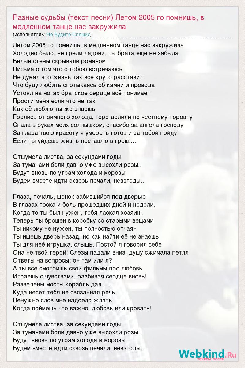 Главная→Исполнители→Не Будите Спящих→Разные судьбы (текст песни) Летом 2005 го помнишь, в медленном танце н