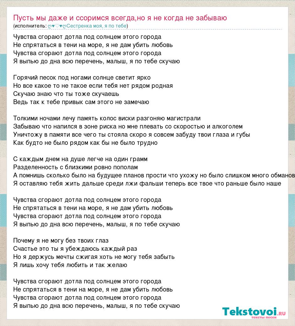 Чувства сгорают дотла под солнцем этого города Не спрятаться в тени на море, я не дам убить любовь Чувства сгорают дотла под солнцем этого города Я выпью до дна всю перечень, малыш, я по тебе скучаю Горячий песок под ногами солнце светит ярко Но все какое то не такое если тебя нет рядом родная Скучаю знаю что ты тоже скучаешь Ведь так к тебе привык сам этого не замечаю Толкими ночами лечу память колос виски разгоняю магистрали Забываю что напился в зоне риска но мне плевать со скоростью и алкоголем Уничтожу в памяти все чего ты стояла скоро я совсем забуду твои глаза и губы Как будто не было рядом как бы не было трудно С каждым днем на душе легче на один грамм Разделенность с близкими ровно пополам А помнишь сколько было на будущее планов прости что ухожу но было слишком много обманов Я оставляю тебя жить дальше среди лжи фальши теперь все твое что раньше было наше Чувства сгорают дотла под солнцем этого города Не спрятаться в тени на море, я не дам убить любовь Чувства сгорают дотла под солнцем этого города Я выпью до дна всю перечень, малыш, я по тебе скучаю Почему я не могу без твоих глаз Счастье это ты я убеждаюсь каждый раз Но я держусь мечты сжигая хоть не могу тебя забыть Я лишь хочу тебя любить и так желаю Чувства сгорают дотла под солнцем этого города Не спрятаться в тени на море, я не дам убить любовь Чувства сгорают дотла под солнцем этого города Я выпью до дна всю перечень, малыш, я по тебе скучаю