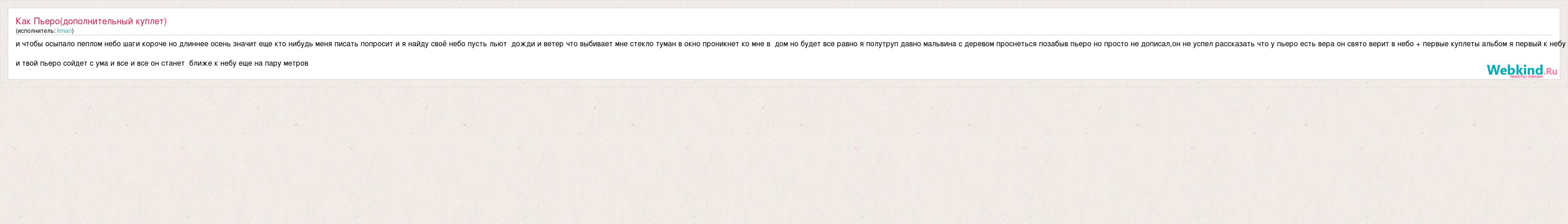 и чтобы осыпало пеплом небо шаги короче но длиннее осень значит еще кто нибудь меня писать попросит и я найду своё небо пусть льют дожди и ветер что выбивает мне стекло туман в окно проникнет ко мне в дом но будет все равно я полутруп давно мальвина с деревом проснеться позабыв пьеро но просто не дописал,он не успел рассказать что у пьеро есть вера он свято верит в небо + первые куплеты альбом я первый к небу и твой пьеро сойдет с ума и все и все он станет ближе к небу еще на пару метров