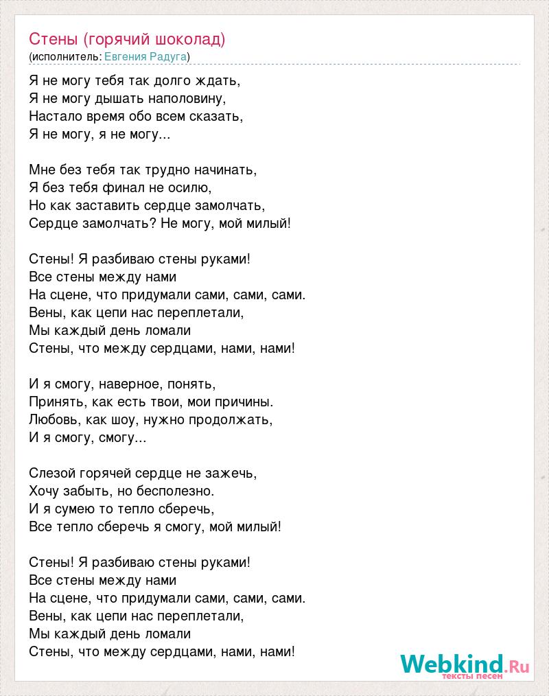 Я не могу тебя так долго ждать, Я не могу дышать наполовину, Настало время обо всем сказать, Я не могу, я не могу... Мне без тебя так трудно начинать, Я без тебя финал не осилю, Но как заставить сердце замолчать, Сердце замолчать? Не могу, мой милый! Стены! Я разбиваю стены руками! Все стены между нами На сцене, что придумали сами, сами, сами. Вены, как цепи нас переплетали, Мы каждый день ломали Стены, что между сердцами, нами, нами! И я смогу, наверное, понять, Принять, как есть твои, мои причины. Любовь, как шоу, нужно продолжать, И я смогу, смогу... Слезой горячей сердце не зажечь, Хочу забыть, но бесполезно. И я сумею то тепло сберечь, Все тепло сберечь я смогу, мой милый! Стены! Я разбиваю стены руками! Все стены между нами На сцене, что придумали сами, сами, сами. Вены, как цепи нас переплетали, Мы каждый день ломали Стены, что между сердцами, нами, нами!