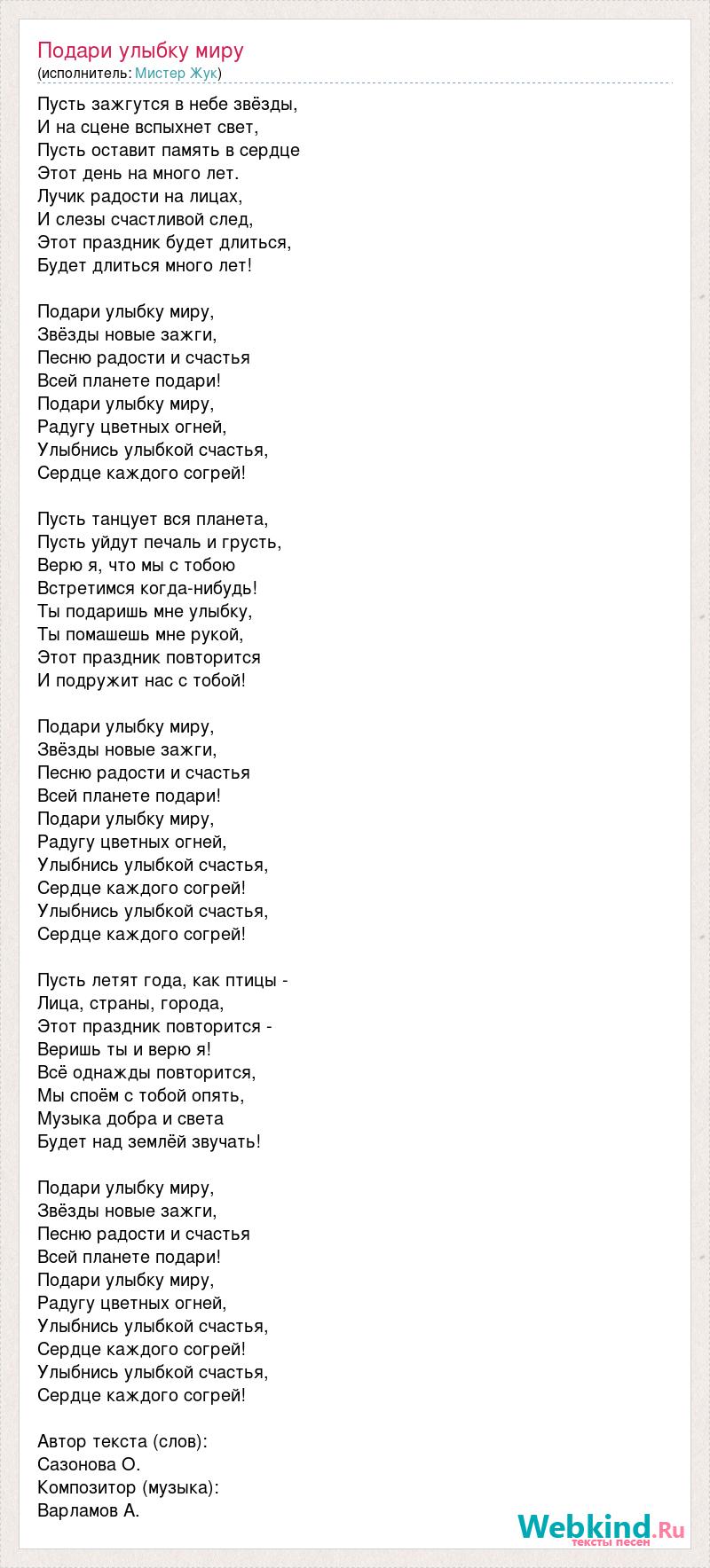 Пусть зажгутся в небе звёзды, И на сцене вспыхнет свет, Пусть оставит память в сердце Этот день на много лет. Лучик радости на лицах, И слезы счастливой след, Этот праздник будет длиться, Будет длиться много лет! Подари улыбку миру, Звёзды новые зажги, Песню радости и счастья Всей планете подари! Подари улыбку миру, Радугу цветных огней, Улыбнись улыбкой счастья, Сердце каждого согрей! Пусть танцует вся планета, Пусть уйдут печаль и грусть, Верю я, что мы с тобою Встретимся когда-нибудь! Ты подаришь мне улыбку, Ты помашешь мне рукой, Этот праздник повторится И подружит нас с тобой! Подари улыбку миру, Звёзды новые зажги, Песню радости и счастья Всей планете подари! Подари улыбку миру, Радугу цветных огней, Улыбнись улыбкой счастья, Сердце каждого согрей! Улыбнись улыбкой счастья, Сердце каждого согрей! Пусть летят года, как птицы - Лица, страны, города, Этот праздник повторится - Веришь ты и верю я! Всё однажды повторится, Мы споём с тобой опять, Музыка добра и света Будет над землёй звучать! Подари улыбку миру, Звёзды новые зажги, Песню радости и счастья Всей планете подари! Подари улыбку миру, Радугу цветных огней, Улыбнись улыбкой счастья, Сердце каждого согрей! Улыбнись улыбкой счастья, Сердце каждого согрей! Автор текста (слов): Сазонова О. Композитор (музыка): Варламов А.