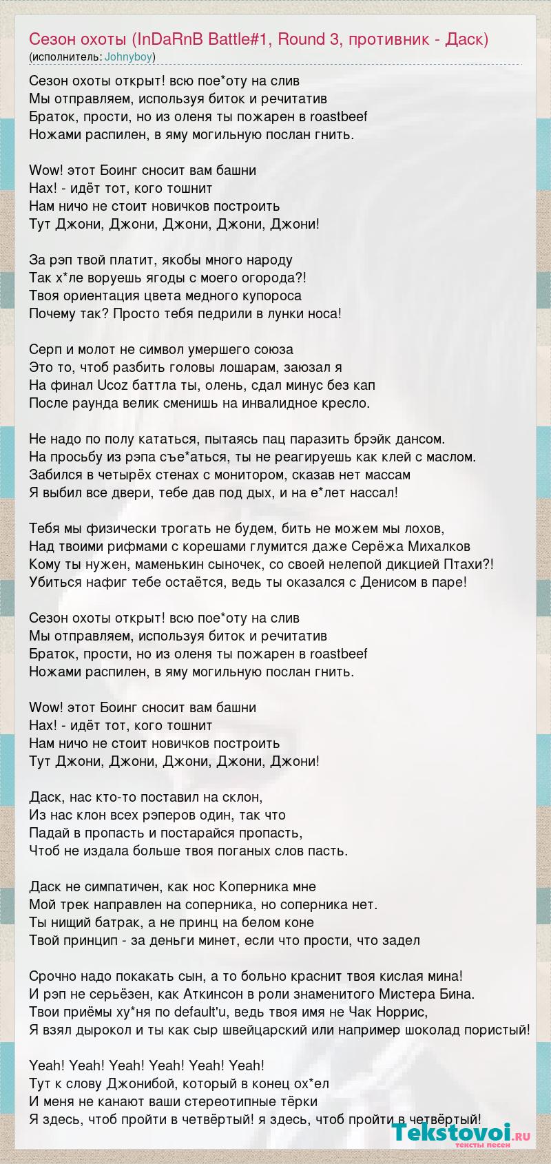 Сезон охоты открыт! всю пое*оту на слив Мы отправляем, используя биток и речитатив Браток, прости, но из оленя ты пожарен в roastbeef Ножами распилен, в яму могильную послан гнить. Wow! этот Боинг сносит вам башни Нах! - идёт тот, кого тошнит Нам ничо не стоит новичков построить Тут Джони, Джони, Джони, Джони, Джони! За рэп твой платит, якобы много народу Так х*ле воруешь ягоды с моего огорода?! Твоя ориентация цвета медного купороса Почему так? Просто тебя педрили в лунки носа! Серп и молот не символ умершего союза Это то, чтоб разбить головы лошарам, заюзал я На финал Ucoz баттла ты, олень, сдал минус без кап После раунда велик сменишь на инвалидное кресло. Не надо по полу кататься, пытаясь пац паразить брэйк дансом. На просьбу из рэпа съе*аться, ты не реагируешь как клей с маслом. Забился в четырёх стенах с монитором, сказав нет массам Я выбил все двери, тебе дав под дых, и на е*лет нассал! Тебя мы физически трогать не будем, бить не можем мы лохов, Над твоими рифмами с корешами глумится даже Серёжа Михалков Кому ты нужен, маменькин сыночек, со своей нелепой дикцией Птахи?! Убиться нафиг тебе остаётся, ведь ты оказался с Денисом в паре! Сезон охоты открыт! всю пое*оту на слив Мы отправляем, используя биток и речитатив Браток, прости, но из оленя ты пожарен в roastbeef Ножами распилен, в яму могильную послан гнить. Wow! этот Боинг сносит вам башни Нах! - идёт тот, кого тошнит Нам ничо не стоит новичков построить Тут Джони, Джони, Джони, Джони, Джони! Даск, нас кто-то поставил на склон, Из нас клон всех рэперов один, так что Падай в пропасть и постарайся пропасть, Чтоб не издала больше твоя поганых слов пасть. Даск не симпатичен, как нос Коперника мне Мой трек направлен на соперника, но соперника нет. Ты нищий батрак, а не принц на белом коне Твой принцип - за деньги минет, если что прости, что задел Срочно надо покакать сын, а то больно краснит твоя кислая мина! И рэп не серьёзен, как Аткинсон в роли знаменитого Мистера Бина. Твои приёмы ху*ня по default'u, ведь твоя имя не Чак Норрис, Я взял дырокол и ты как сыр швейцарский или например шоколад пористый! Yeah! Yeah! Yeah! Yeah! Yeah! Yeah! Тут к слову Джонибой, который в конец ох*ел И меня не канают ваши стереотипные тёрки Я здесь, чтоб пройти в четвёртый! я здесь, чтоб пройти в четвёртый!