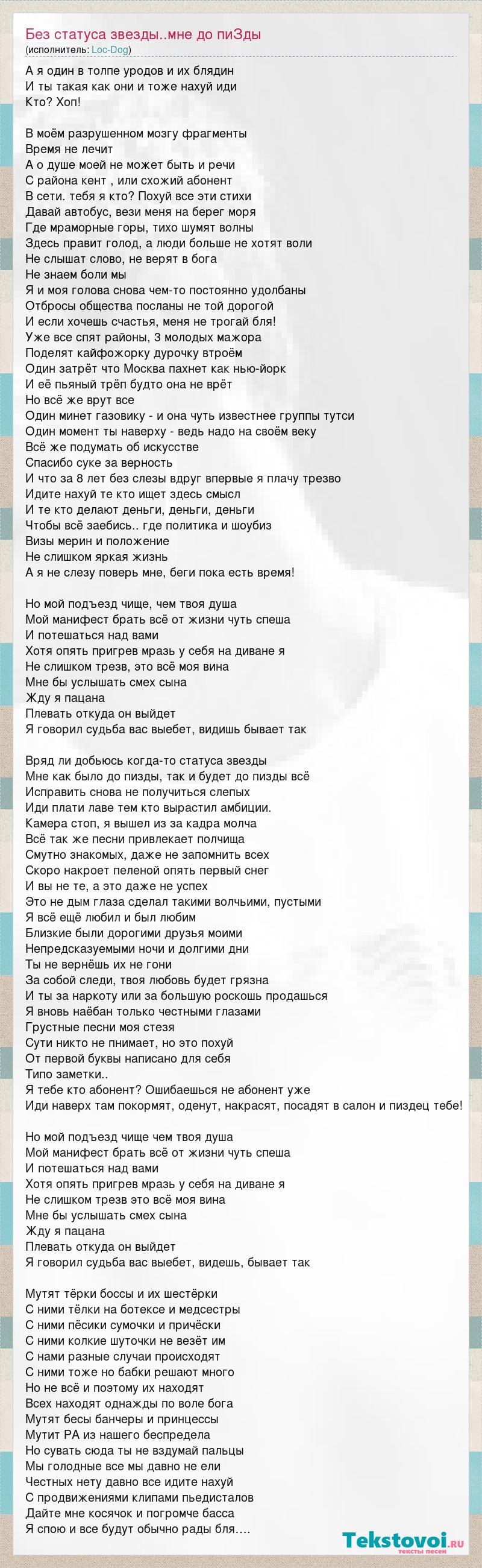 А я один в толпе уродов и их блядин И ты такая как они и тоже нахуй иди Кто? Хоп! В моём разрушенном мозгу фрагменты Время не лечит А о душе моей не может быть и речи С района кент , или схожий абонент В сети. тебя я кто? Похуй все эти стихи Давай автобус, вези меня на берег моря Где мраморные горы, тихо шумят волны Здесь правит голод, а люди больше не хотят воли Не слышат слово, не верят в бога Не знаем боли мы Я и моя голова снова чем-то постоянно удолбаны Отбросы общества посланы не той дорогой И если хочешь счастья, меня не трогай бля! Уже все спят районы, 3 молодых мажора Поделят кайфожорку дурочку втроём Один затрёт что Москва пахнет как нью-йорк И её пьяный трёп будто она не врёт Но всё же врут все Один минет газовику - и она чуть известнее группы тутси Один момент ты наверху - ведь надо на своём веку Всё же подумать об искусстве Спасибо суке за верность И что за 8 лет без слезы вдруг впервые я плачу трезво Идите нахуй те кто ищет здесь смысл И те кто делают деньги, деньги, деньги Чтобы всё заебись.. где политика и шоубиз Визы мерин и положение Не слишком яркая жизнь А я не слезу поверь мне, беги пока есть время! Но мой подъезд чище, чем твоя душа Мой манифест брать всё от жизни чуть спеша И потешаться над вами Хотя опять пригрев мразь у себя на диване я Не слишком трезв, это всё моя вина Мне бы услышать смех сына Жду я пацана Плевать откуда он выйдет Я говорил судьба вас выебет, видишь бывает так Вряд ли добьюсь когда-то статуса звезды Мне как было до пизды, так и будет до пизды всё Исправить снова не получиться слепых Иди плати лаве тем кто вырастил амбиции. Камера стоп, я вышел из за кадра молча Всё так же песни привлекает полчища Смутно знакомых, даже не запомнить всех Скоро накроет пеленой опять первый снег И вы не те, а это даже не успех Это не дым глаза сделал такими волчьими, пустыми Я всё ещё любил и был любим Близкие были дорогими друзья моими Непредсказуемыми ночи и долгими дни Ты не вернёшь их не гони За собой следи, твоя любовь будет грязна И ты за наркоту или за большую роскошь продашься Я вновь наёбан только честными глазами Грустные песни моя стезя Сути никто не пнимает, но это похуй От первой буквы написано для себя Типо заметки.. Я тебе кто абонент? Ошибаешься не абонент уже Иди наверх там покормят, оденут, накрасят, посадят в салон и пиздец тебе! Но мой подъезд чище чем твоя душа Мой манифест брать всё от жизни чуть спеша И потешаться над вами Хотя опять пригрев мразь у себя на диване я Не слишком трезв это всё моя вина Мне бы услышать смех сына Жду я пацана Плевать откуда он выйдет Я говорил судьба вас выебет, видешь, бывает так Мутят тёрки боссы и их шестёрки С ними тёлки на ботексе и медсестры С ними пёсики сумочки и причёски С ними колкие шуточки не везёт им С нами разные случаи происходят С ними тоже но бабки решают много Но не всё и поэтому их находят Всех находят однажды по воле бога Мутят бесы банчеры и принцессы Мутит РА из нашего беспредела Но сувать сюда ты не вздумай пальцы Мы голодные все мы давно не ели Честных нету давно все идите нахуй С продвижениями клипами пьедисталов Дайте мне косячок и погромче басса Я спою и все будут обычно рады бля….