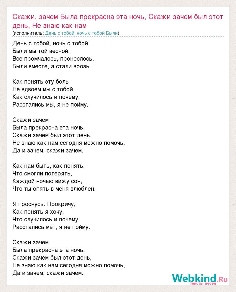 День с тобой, ночь с тобой Были мы той весной, Все промчалось, пронеслось. Были вместе, а стали врозь. Как понять эту боль Не вдвоем мы с тобой, Как случилось и почему, Расстались мы, я не пойму. Скажи зачем Была прекрасна эта ночь, Скажи зачем был этот день, Не знаю как нам сегодня можно помочь, Да и зачем, скажи зачем. Как нам быть, как понять, Что смогли потерять, Каждой ночью вижу сон, Что ты опять в меня влюблен. Я проснусь. Прокричу, Как понять я хочу, Что случилось и почему Расстались мы , я не пойму. Скажи зачем Была прекрасна эта ночь, Скажи зачем был этот день, Не знаю как нам сегодня можно помочь, Да и зачем, скажи зачем.