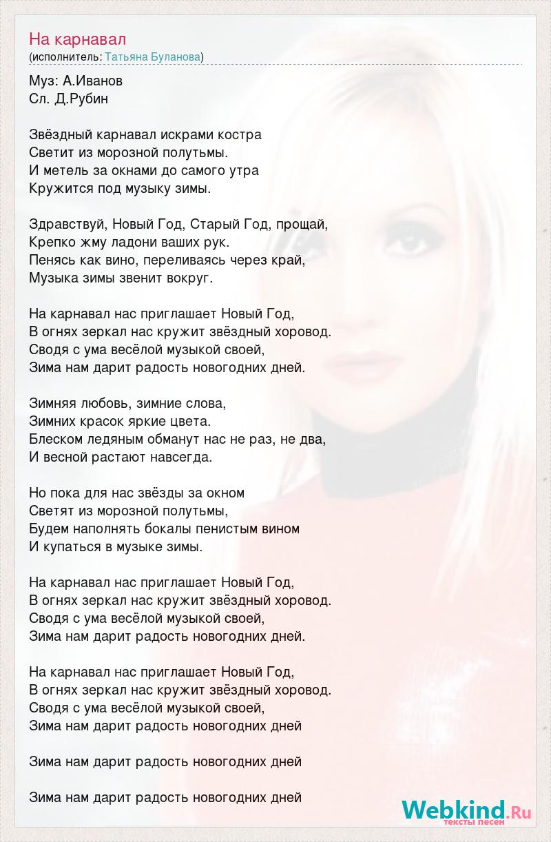 Муз: А.Иванов Сл. Д.Рубин Звёздный карнавал искрами костра Светит из морозной полутьмы. И метель за окнами до самого утра Кружится под музыку зимы. Здравствуй, Новый Год, Старый Год, прощай, Крепко жму ладони ваших рук. Пенясь как вино, переливаясь через край, Музыка зимы звенит вокруг. На карнавал нас приглашает Новый Год, В огнях зеркал нас кружит звёздный хоровод. Сводя с ума весёлой музыкой своей, Зима нам дарит радость новогодних дней. Зимняя любовь, зимние слова, Зимних красок яркие цвета. Блеском ледяным обманут нас не раз, не два, И весной растают навсегда. Но пока для нас звёзды за окном Светят из морозной полутьмы, Будем наполнять бокалы пенистым вином И купаться в музыке зимы. На карнавал нас приглашает Новый Год, В огнях зеркал нас кружит звёздный хоровод. Сводя с ума весёлой музыкой своей, Зима нам дарит радость новогодних дней. На карнавал нас приглашает Новый Год, В огнях зеркал нас кружит звёздный хоровод. Сводя с ума весёлой музыкой своей, Зима нам дарит радость новогодних дней Зима нам дарит радость новогодних дней Зима нам дарит радость новогодних дней