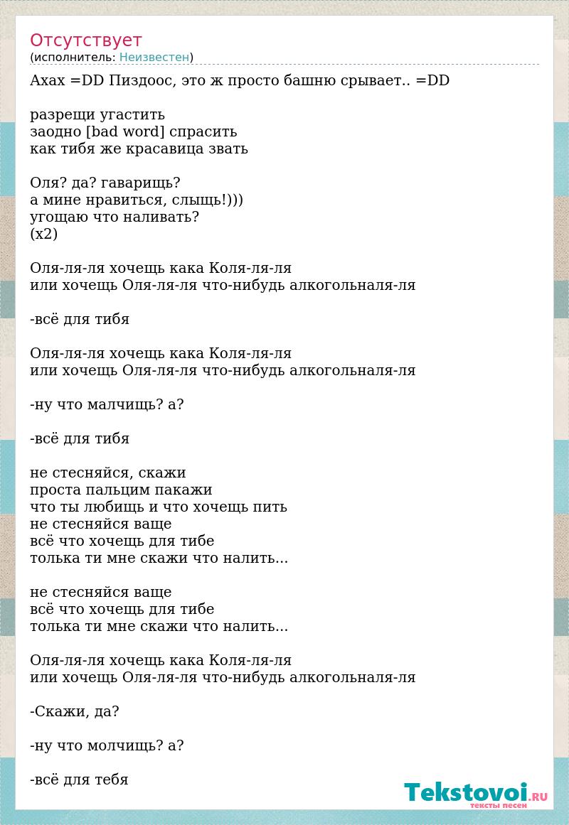 Ахах =DD Пиздоос, это ж просто башню срывает.. =DD разрещи угастить заодно [bad word] спрасить как тибя же красавица звать Оля? да? гаварищь? а мине нравиться, слыщь!))) угощаю что наливать? (х2) Оля-ля-ля хочещь кака Коля-ля-ля или хочещь Оля-ля-ля что-нибудь алкогольналя-ля -всё для тибя Оля-ля-ля хочещь кака Коля-ля-ля или хочещь Оля-ля-ля что-нибудь алкогольналя-ля -ну что малчищь? а? -всё для тибя не стесняйся, скажи проста пальцим пакажи что ты любищь и что хочещь пить не стесняйся ваще всё что хочещь для тибе толька ти мне скажи что налить... не стесняйся ваще всё что хочещь для тибе толька ти мне скажи что налить... Оля-ля-ля хочещь кака Коля-ля-ля или хочещь Оля-ля-ля что-нибудь алкогольналя-ля -Скажи, да? -ну что молчищь? а? -всё для тебя