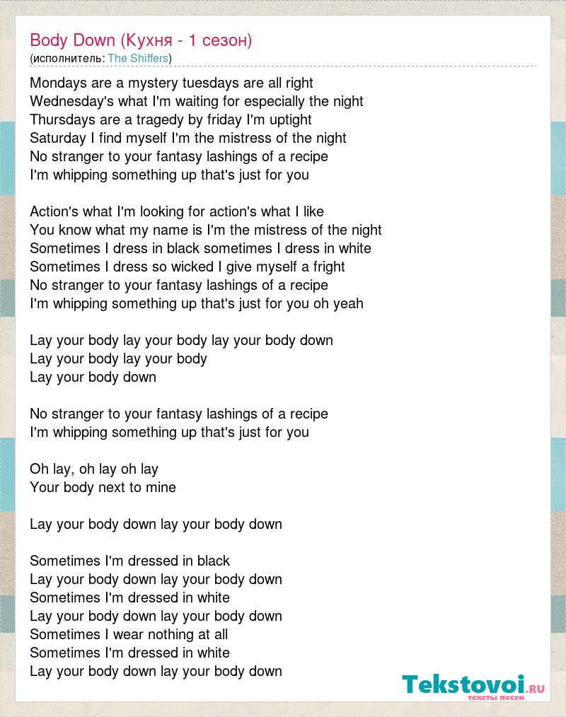 Mondays are a mystery tuesdays are all right Wednesday's what I'm waiting for especially the night Thursdays are a tragedy by friday I'm uptight Saturday I find myself I'm the mistress of the night No stranger to your fantasy lashings of a recipe I'm whipping something up that's just for you Action's what I'm looking for action's what I like You know what my name is I'm the mistress of the night Sometimes I dress in black sometimes I dress in white Sometimes I dress so wicked I give myself a fright No stranger to your fantasy lashings of a recipe I'm whipping something up that's just for you oh yeah Lay your body lay your body lay your body down Lay your body lay your body Lay your body down No stranger to your fantasy lashings of a recipe I'm whipping something up that's just for you Oh lay, oh lay oh lay Your body next to mine Lay your body down lay your body down Sometimes I'm dressed in black Lay your body down lay your body down Sometimes I'm dressed in white Lay your body down lay your body down Sometimes I wear nothing at all Sometimes I'm dressed in white Lay your body down lay your body down