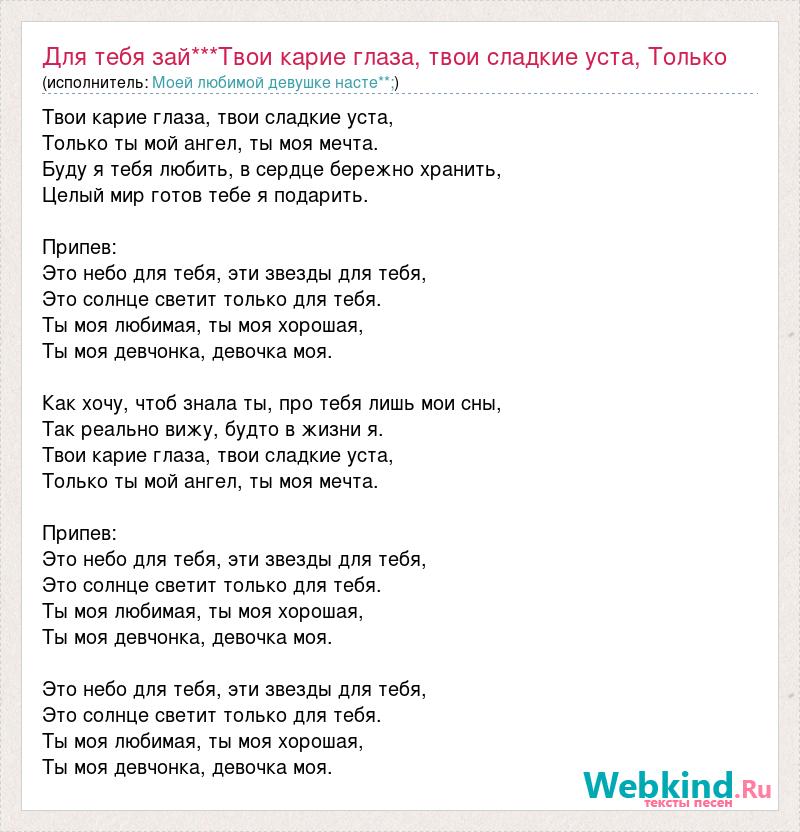 Главная→Исполнители→Моей любимой девушке насте**;→Для тебя зай***Твои карие глаза, твои сладкие уста, Только ты мой ангел, ты моя