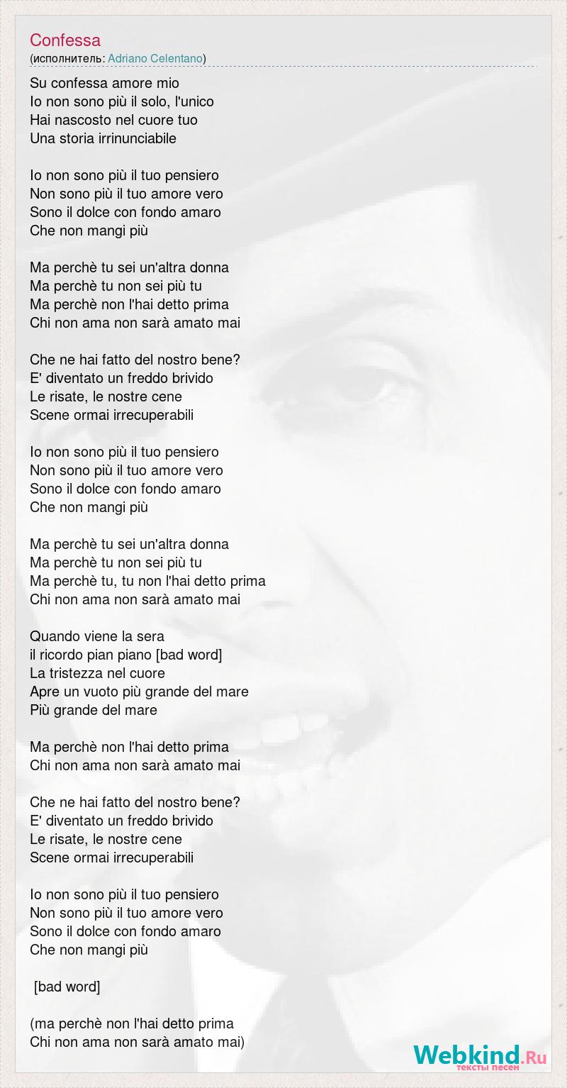 Su confessa amore mio Io non sono più il solo, l'unico Hai nascosto nel cuore tuo Una storia irrinunciabile Io non sono più il tuo pensiero Non sono più il tuo amore vero Sono il dolce con fondo amaro Che non mangi più Ma perchè tu sei un'altra donna Ma perchè tu non sei più tu Ma perchè non l'hai detto prima Chi non ama non sarà amato mai Che ne hai fatto del nostro bene? E' diventato un freddo brivido Le risate, le nostre cene Scene ormai irrecuperabili Io non sono più il tuo pensiero Non sono più il tuo amore vero Sono il dolce con fondo amaro Che non mangi più Ma perchè tu sei un'altra donna Ma perchè tu non sei più tu Ma perchè tu, tu non l'hai detto prima Chi non ama non sarà amato mai Quando viene la sera il ricordo pian piano [bad word] La tristezza nel cuore Apre un vuoto più grande del mare Più grande del mare Ma perchè non l'hai detto prima Chi non ama non sarà amato mai Che ne hai fatto del nostro bene? E' diventato un freddo brivido Le risate, le nostre cene Scene ormai irrecuperabili Io non sono più il tuo pensiero Non sono più il tuo amore vero Sono il dolce con fondo amaro Che non mangi più [bad word] (ma perchè non l'hai detto prima Chi non ama non sarà amato mai)