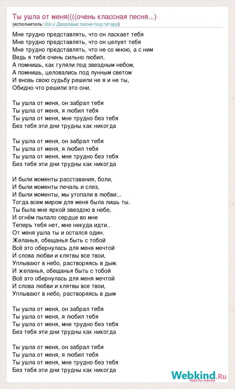 Мне трудно представлять, что он ласкает тебя Мне трудно представлять, что он целует тебя Мне трудно представлять, что не со мною, а с ним Ведь я тебя очень сильно любил. А помнишь, как гуляли под звездным небом, А помнишь, целовались под лунным светом И вновь свою судьбу решили не я и не ты, Обидно что решили это они. Ты ушла от меня, он забрал тебя Ты ушла от меня, я любил тебя Ты ушла от меня, мне трудно без тебя Без тебя эти дни трудны как никогда Ты ушла от меня, он забрал тебя Ты ушла от меня, я любил тебя Ты ушла от меня, мне трудно без тебя Без тебя эти дни трудны как никогда И были моменты расставания, боли, И были моменты печаль и слез, И были моменты, мы утопали в любви... Тогда всем миром для меня была лишь ты. Ты была мне яркой звездою в небе, И огнём пылало сердце во мне Теперь тебя нет, мне некуда идти.. От меня ушла ты и остался один. Желанья, обещанья быть с тобой Всё это обернулась для меня мечтой И слова любви и клятвы все твои, Уплывают в небо, растворяясь в дым. И желанья, обещанья быть с тобой Всё это обернулась для меня мечтой И слова любви и клятвы все твои, Уплывают в небо, растворяясь в дым Ты ушла от меня, он забрал тебя Ты ушла от меня, я любил тебя Ты ушла от меня, мне трудно без тебя Без тебя эти дни трудны как никогда Ты ушла от меня, он забрал тебя Ты ушла от меня, я любил тебя Ты ушла от меня, мне трудно без тебя Без тебя эти дни трудны как никогда