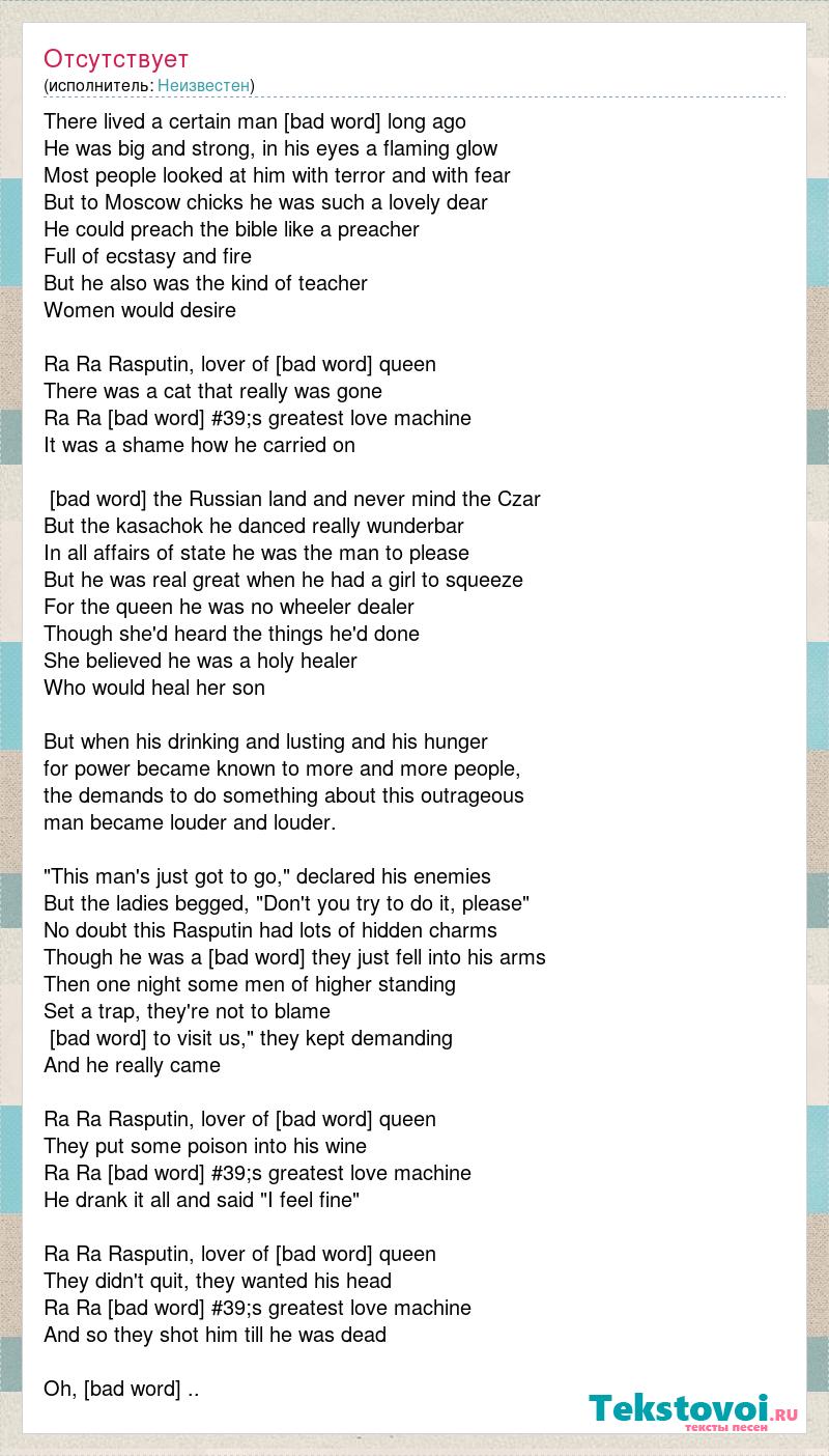There lived a certain man in Russia long ago He was big and strong, in his eyes a flaming glow Most people looked at him with terror and with fear But to Moscow chicks he was such a lovely dear He could preach the bible like a preacher Full of ecstasy and fire But he also was the kind of teacher Women would desire Ra Ra Rasputin, lover of the Russian queen There was a cat that really was gone Ra Ra Rasputin, Russia's greatest love machine It was a shame how he carried on He ruled the Russian land and never mind the Czar But the kasachok he danced really wunderbar In all affairs of state he was the man to please But he was real great when he had a girl to squeeze For the queen he was no wheeler dealer Though she'd heard the things he'd done She believed he was a holy healer Who would heal her son But when his drinking and lusting and his hunger for power became known to more and more people, the demands to do something about this outrageous man became louder and louder. "This man's just got to go," declared his enemies But the ladies begged, "Don't you try to do it, please" No doubt this Rasputin had lots of hidden charms Though he was a brute they just fell into his arms Then one night some men of higher standing Set a trap, they're not to blame "Come to visit us," they kept demanding And he really came Ra Ra Rasputin, lover of the Russian queen They put some poison into his wine Ra Ra Rasputin, Russia's greatest love machine He drank it all and said "I feel fine" Ra Ra Rasputin, lover of the Russian queen They didn't quit, they wanted his head Ra Ra Rasputin, Russia's greatest love machine And so they shot him till he was dead Oh, those Russians...