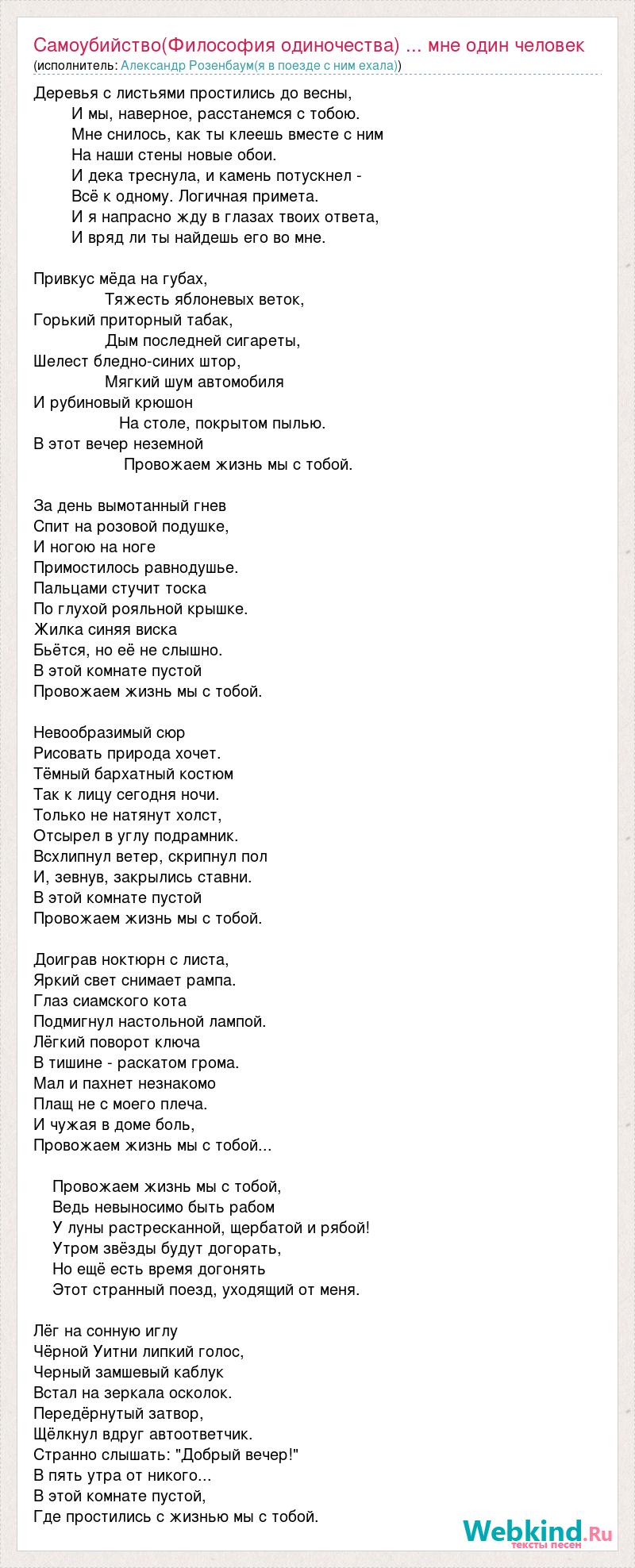 Главная→Исполнители→Александр Розенбаум(я в поезде с ним ехала)→Самоубийство(Философия одиночества) ... мне один человек сказал когда-т