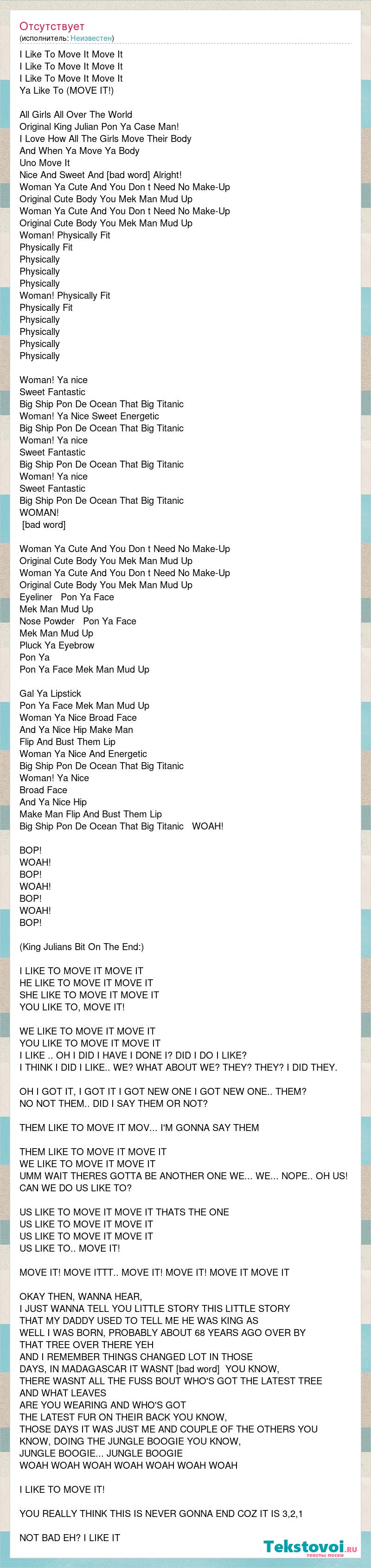 I Like To Move It Move It I Like To Move It Move It I Like To Move It Move It Ya Like To (MOVE IT!) All Girls All Over The World Original King Julian Pon Ya Case Man! I Love How All The Girls Move Their Body And When Ya Move Ya Body Uno Move It Nice And Sweet And [bad word] Alright! Woman Ya Cute And You Don t Need No Make-Up Original Cute Body You Mek Man Mud Up Woman Ya Cute And You Don t Need No Make-Up Original Cute Body You Mek Man Mud Up Woman! Physically Fit Physically Fit Physically Physically Physically Woman! Physically Fit Physically Fit Physically Physically Physically Physically Woman! Ya nice Sweet Fantastic Big Ship Pon De Ocean That Big Titanic Woman! Ya Nice Sweet Energetic Big Ship Pon De Ocean That Big Titanic Woman! Ya nice Sweet Fantastic Big Ship Pon De Ocean That Big Titanic Woman! Ya nice Sweet Fantastic Big Ship Pon De Ocean That Big Titanic WOMAN! (Chorus) Woman Ya Cute And You Don t Need No Make-Up Original Cute Body You Mek Man Mud Up Woman Ya Cute And You Don t Need No Make-Up Original Cute Body You Mek Man Mud Up Eyeliner Pon Ya Face Mek Man Mud Up Nose Powder Pon Ya Face Mek Man Mud Up Pluck Ya Eyebrow Pon Ya Pon Ya Face Mek Man Mud Up Gal Ya Lipstick Pon Ya Face Mek Man Mud Up Woman Ya Nice Broad Face And Ya Nice Hip Make Man Flip And Bust Them Lip Woman Ya Nice And Energetic Big Ship Pon De Ocean That Big Titanic Woman! Ya Nice Broad Face And Ya Nice Hip Make Man Flip And Bust Them Lip Big Ship Pon De Ocean That Big Titanic WOAH! BOP! WOAH! BOP! WOAH! BOP! WOAH! BOP! (King Julians Bit On The End:) I LIKE TO MOVE IT MOVE IT HE LIKE TO MOVE IT MOVE IT SHE LIKE TO MOVE IT MOVE IT YOU LIKE TO, MOVE IT! WE LIKE TO MOVE IT MOVE IT YOU LIKE TO MOVE IT MOVE IT I LIKE .. OH I DID I HAVE I DONE I? DID I DO I LIKE? I THINK I DID I LIKE.. WE? WHAT ABOUT WE? THEY? THEY? I DID THEY. OH I GOT IT, I GOT IT I GOT NEW ONE I GOT NEW ONE.. THEM? NO NOT THEM.. DID I SAY THEM OR NOT? THEM LIKE TO MOVE IT MOV... I'M GONNA SAY THEM THEM LIKE TO MOVE IT MOVE IT WE LIKE TO MOVE IT MOVE IT UMM WAIT THERES GOTTA BE ANOTHER ONE WE... WE... NOPE.. OH US! CAN WE DO US LIKE TO? US LIKE TO MOVE IT MOVE IT THATS THE ONE US LIKE TO MOVE IT MOVE IT US LIKE TO MOVE IT MOVE IT US LIKE TO.. MOVE IT! MOVE IT! MOVE ITTT.. MOVE IT! MOVE IT! MOVE IT MOVE IT OKAY THEN, WANNA HEAR, I JUST WANNA TELL YOU LITTLE STORY THIS LITTLE STORY THAT MY DADDY USED TO TELL ME HE WAS KING AS WELL I WAS BORN, PROBABLY ABOUT 68 YEARS AGO OVER BY THAT TREE OVER THERE YEH AND I REMEMBER THINGS CHANGED LOT IN THOSE DAYS, IN MADAGASCAR IT WASNT SO COMMERCIAL, YOU KNOW, THERE WASNT ALL THE FUSS BOUT WHO'S GOT THE LATEST TREE AND WHAT LEAVES ARE YOU WEARING AND WHO'S GOT THE LATEST FUR ON THEIR BACK YOU KNOW, THOSE DAYS IT WAS JUST ME AND COUPLE OF THE OTHERS YOU KNOW, DOING THE JUNGLE BOOGIE YOU KNOW, JUNGLE BOOGIE... JUNGLE BOOGIE WOAH WOAH WOAH WOAH WOAH WOAH WOAH I LIKE TO MOVE IT! YOU REALLY THINK THIS IS NEVER GONNA END COZ IT IS 3,2,1 NOT BAD EH? I LIKE IT