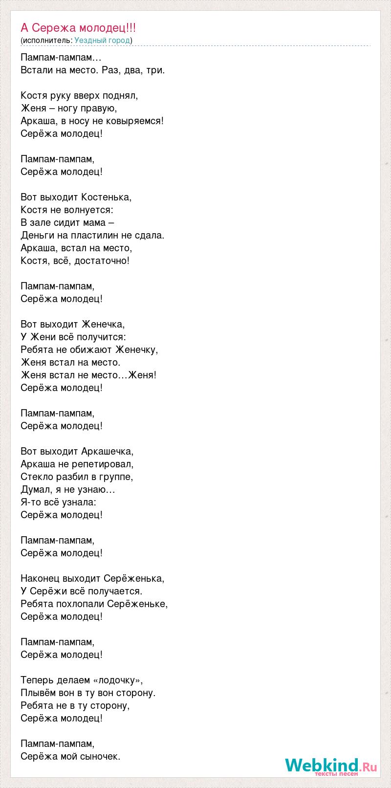 Пампам-пампам… Встали на место. Раз, два, три. Костя руку вверх поднял, Женя – ногу правую, Аркаша, в носу не ковыряемся! Серёжа молодец! Пампам-пампам, Серёжа молодец! Вот выходит Костенька, Костя не волнуется: В зале сидит мама – Деньги на пластилин не сдала. Аркаша, встал на место, Костя, всё, достаточно! Пампам-пампам, Серёжа молодец! Вот выходит Женечка, У Жени всё получится: Ребята не обижают Женечку, Женя встал на место. Женя встал не место…Женя! Серёжа молодец! Пампам-пампам, Серёжа молодец! Вот выходит Аркашечка, Аркаша не репетировал, Стекло разбил в группе, Думал, я не узнаю… Я-то всё узнала: Серёжа молодец! Пампам-пампам, Серёжа молодец! Наконец выходит Серёженька, У Серёжи всё получается. Ребята похлопали Серёженьке, Серёжа молодец! Пампам-пампам, Серёжа молодец! Теперь делаем «лодочку», Плывём вон в ту вон сторону. Ребята не в ту сторону, Серёжа молодец! Пампам-пампам, Серёжа мой сыночек.