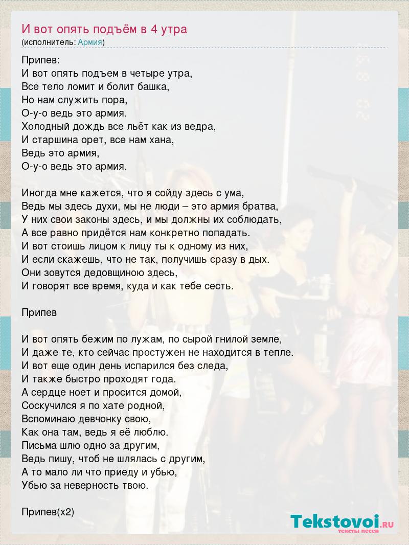 Припев: И вот опять подъем в четыре утра, Все тело ломит и болит башка, Но нам служить пора, О-у-о ведь это армия. Холодный дождь все льёт как из ведра, И старшина орет, все нам хана, Ведь это армия, О-у-о ведь это армия. Иногда мне кажется, что я сойду здесь с ума, Ведь мы здесь духи, мы не люди – это армия братва, У них свои законы здесь, и мы должны их соблюдать, А все равно придётся нам конкретно попадать. И вот стоишь лицом к лицу ты к одному из них, И если скажешь, что не так, получишь сразу в дых. Они зовутся дедовщиною здесь, И говорят все время, куда и как тебе сесть. Припев И вот опять бежим по лужам, по сырой гнилой земле, И даже те, кто сейчас простужен не находится в тепле. И вот еще один день испарился без следа, И также быстро проходят года. А сердце ноет и просится домой, Соскучился я по хате родной, Вспоминаю девчонку свою, Как она там, ведь я её люблю. Письма шлю одно за другим, Ведь пишу, чтоб не шлялась с другим, А то мало ли что приеду и убью, Убью за неверность твою. Припев(х2)