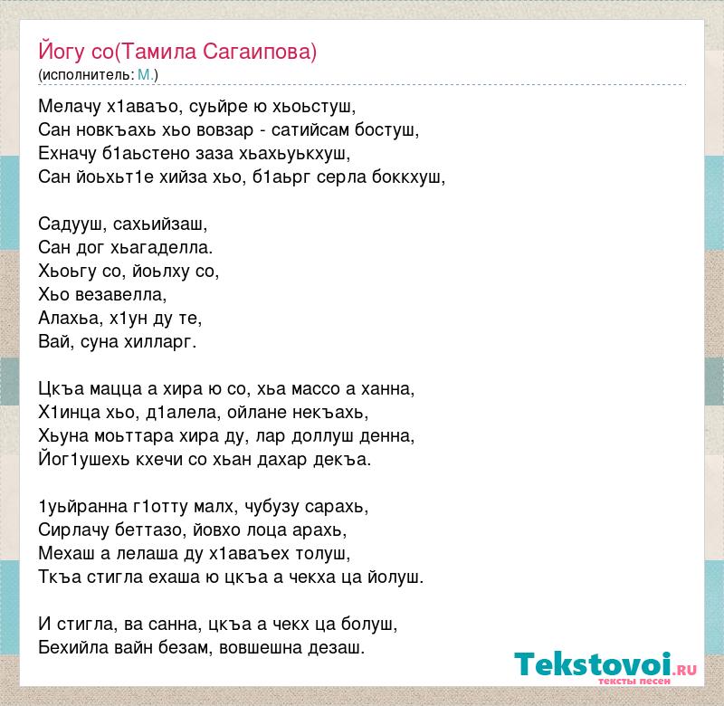 Мелачу х1аваъо, суьйре ю хьоьстуш, Сан новкъахь хьо вовзар - сатийсам бостуш, Ехначу б1аьстено заза хьахьуькхуш, Сан йоьхьт1е хийза хьо, б1аьрг серла боккхуш, Садууш, сахьийзаш, Сан дог хьагаделла. Хьоьгу со, йоьлху со, Хьо везавелла, Алахьа, х1ун ду те, Вай, суна хилларг. Цкъа мацца а хира ю со, хьа массо а ханна, Х1инца хьо, д1алела, ойлане некъахь, Хьуна моьттара хира ду, лар доллуш денна, Йог1ушехь кхечи со хьан дахар декъа. 1уьйранна г1отту малх, чубузу сарахь, Сирлачу беттазо, йовхо лоца арахь, Мехаш а лелаша ду х1аваъех толуш, Ткъа стигла ехаша ю цкъа а чекха ца йолуш. И стигла, ва санна, цкъа а чекх ца болуш, Бехийла вайн безам, вовшешна дезаш.