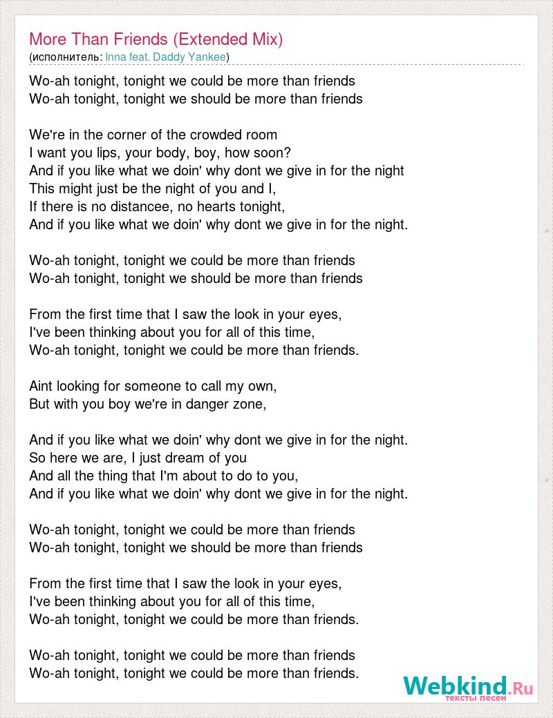 Wo-ah tonight, tonight we could be more than friends Wo-ah tonight, tonight we should be more than friends We're in the corner of the crowded room I want you lips, your body, boy, how soon? And if you like what we doin' why dont we give in for the night This might just be the night of you and I, If there is no distancee, no hearts tonight, And if you like what we doin' why dont we give in for the night. Wo-ah tonight, tonight we could be more than friends Wo-ah tonight, tonight we should be more than friends From the first time that I saw the look in your eyes, I've been thinking about you for all of this time, Wo-ah tonight, tonight we could be more than friends. Aint looking for someone to call my own, But with you boy we're in danger zone, And if you like what we doin' why dont we give in for the night. So here we are, I just dream of you And all the thing that I'm about to do to you, And if you like what we doin' why dont we give in for the night. Wo-ah tonight, tonight we could be more than friends Wo-ah tonight, tonight we should be more than friends From the first time that I saw the look in your eyes, I've been thinking about you for all of this time, Wo-ah tonight, tonight we could be more than friends. Wo-ah tonight, tonight we could be more than friends Wo-ah tonight, tonight we could be more than friends.