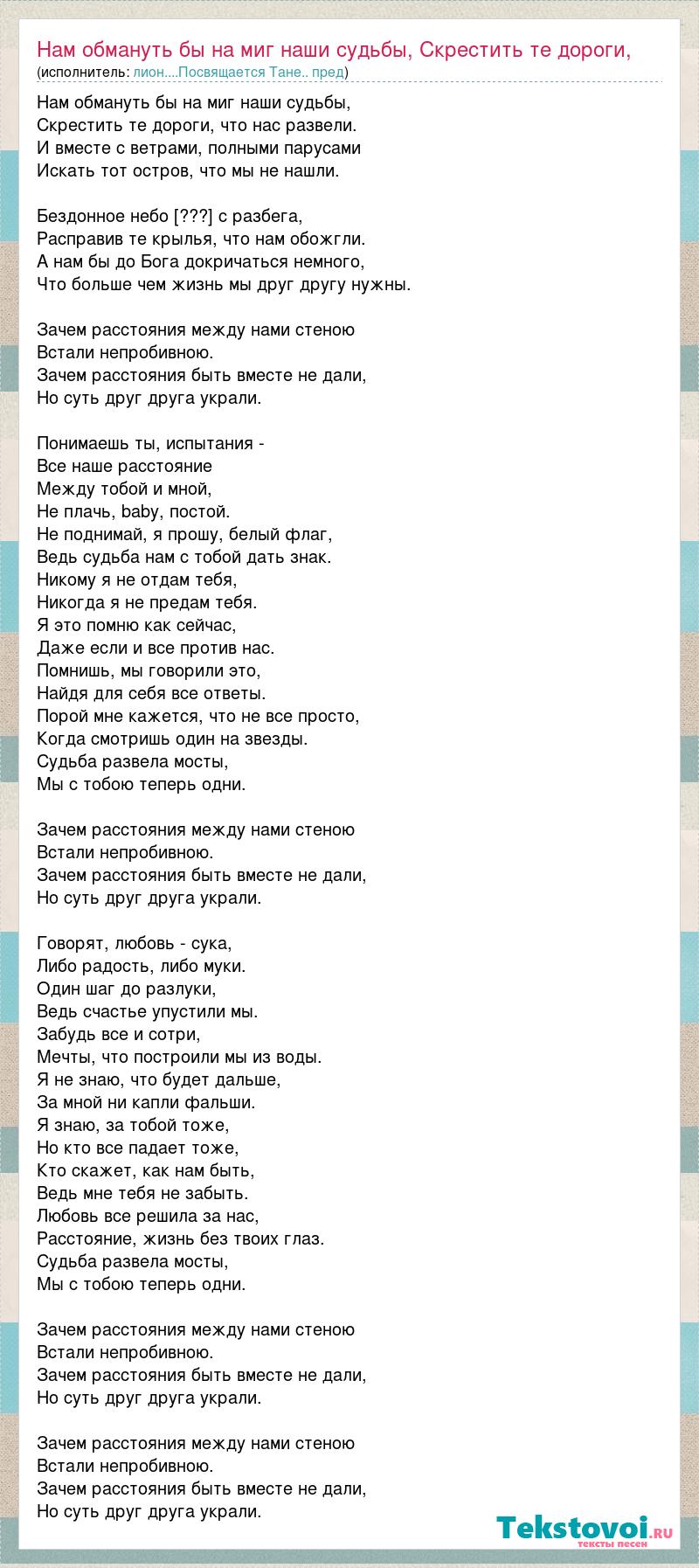 Нам обмануть бы на миг наши судьбы, Скрестить те дороги, что нас развели. И вместе с ветрами, полными парусами Искать тот остров, что мы не нашли. Бездонное небо [???] с разбега, Расправив те крылья, что нам обожгли. А нам бы до Бога докричаться немного, Что больше чем жизнь мы друг другу нужны. Зачем расстояния между нами стеною Встали непробивною. Зачем расстояния быть вместе не дали, Но суть друг друга украли. Понимаешь ты, испытания - Все наше расстояние Между тобой и мной, Не плачь, baby, постой. Не поднимай, я прошу, белый флаг, Ведь судьба нам с тобой дать знак. Никому я не отдам тебя, Никогда я не предам тебя. Я это помню как сейчас, Даже если и все против нас. Помнишь, мы говорили это, Найдя для себя все ответы. Порой мне кажется, что не все просто, Когда смотришь один на звезды. Судьба развела мосты, Мы с тобою теперь одни. Зачем расстояния между нами стеною Встали непробивною. Зачем расстояния быть вместе не дали, Но суть друг друга украли. Говорят, любовь - сука, Либо радость, либо муки. Один шаг до разлуки, Ведь счастье упустили мы. Забудь все и сотри, Мечты, что построили мы из воды. Я не знаю, что будет дальше, За мной ни капли фальши. Я знаю, за тобой тоже, Но кто все падает тоже, Кто скажет, как нам быть, Ведь мне тебя не забыть. Любовь все решила за нас, Расстояние, жизнь без твоих глаз. Судьба развела мосты, Мы с тобою теперь одни. Зачем расстояния между нами стеною Встали непробивною. Зачем расстояния быть вместе не дали, Но суть друг друга украли. Зачем расстояния между нами стеною Встали непробивною. Зачем расстояния быть вместе не дали, Но суть друг друга украли.