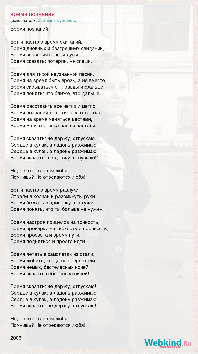 Время познаний Вот и настало время скитаний, Время дневных и безгрешных свиданий, Время спасения вечной души, Время сказать: потерпи, не спеши. Время для тихой неузнанной песни, Время на время быть врозь, а не вместе, Время скрываться от правды и фальши, Время понять: что ближе, что дальше. Время расставить все четко и метко Время познаний кто птица, кто клетка, Время на время меняться местами, Время молчать, пока нас не застали. Время сказать: не держу, отпускаю. Сердце в кулак, а ладонь разжимаю. Сердце в кулак, а ладонь разжимаю, Время сказать" не держу, отпускаю!" Но, не отрекаются любя… Помнишь? Не отрекаются любя! Вот и настало время разлуки. Стрелы в колчан и разомкнуты руки. Время бежать в одиночку от стужи, Время понять, что ты больше не нужен. Время настроя прицелов на точность, Время проверки на гибкость и прочность, Время просвета и время пути, Время подняться и просто идти. Время летать в самолетах из стали, Время любить, когда нас перестали, Время немых, бестелесных ночей, Время сказать себе: снова ничей! Время сказать: не держу, отпускаю! Сердце в кулак, а ладонь разжимаю, Сердце в кулак, а ладонь разжимаю, Время сказать: не держу, отпускаю! Но, не отрекаются любя… Помнишь? Не отрекаются любя! 2006