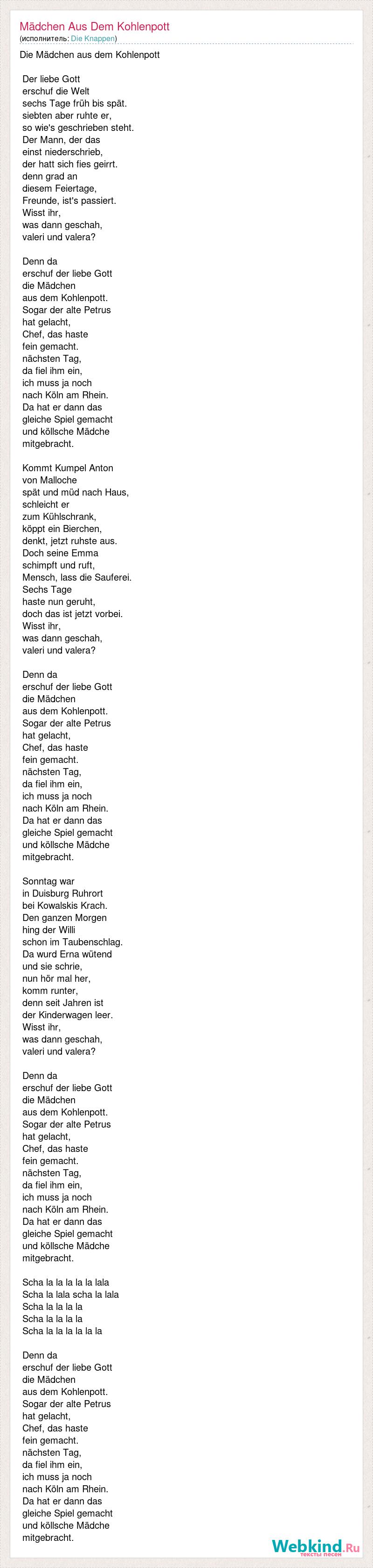 Die Mädchen aus dem Kohlenpott Der liebe Gott erschuf die Welt sechs Tage früh bis spät. siebten aber ruhte er, so wie's geschrieben steht. Der Mann, der das einst niederschrieb, der hatt sich fies geirrt. denn grad an diesem Feiertage, Freunde, ist's passiert. Wisst ihr, was dann geschah, valeri und valera? Denn da erschuf der liebe Gott die Mädchen aus dem Kohlenpott. Sogar der alte Petrus hat gelacht, Chef, das haste fein gemacht. nächsten Tag, da fiel ihm ein, ich muss ja noch nach Köln am Rhein. Da hat er dann das gleiche Spiel gemacht und köllsche Mädche mitgebracht. Kommt Kumpel Anton von Malloche spät und müd nach Haus, schleicht er zum Kühlschrank, köppt ein Bierchen, denkt, jetzt ruhste aus. Doch seine Emma schimpft und ruft, Mensch, lass die Sauferei. Sechs Tage haste nun geruht, doch das ist jetzt vorbei. Wisst ihr, was dann geschah, valeri und valera? Denn da erschuf der liebe Gott die Mädchen aus dem Kohlenpott. Sogar der alte Petrus hat gelacht, Chef, das haste fein gemacht. nächsten Tag, da fiel ihm ein, ich muss ja noch nach Köln am Rhein. Da hat er dann das gleiche Spiel gemacht und köllsche Mädche mitgebracht. Sonntag war in Duisburg Ruhrort bei Kowalskis Krach. Den ganzen Morgen hing der Willi schon im Taubenschlag. Da wurd Erna wütend und sie schrie, nun hör mal her, komm runter, denn seit Jahren ist der Kinderwagen leer. Wisst ihr, was dann geschah, valeri und valera? Denn da erschuf der liebe Gott die Mädchen aus dem Kohlenpott. Sogar der alte Petrus hat gelacht, Chef, das haste fein gemacht. nächsten Tag, da fiel ihm ein, ich muss ja noch nach Köln am Rhein. Da hat er dann das gleiche Spiel gemacht und köllsche Mädche mitgebracht. Scha la la la la la lala Scha la lala scha la lala Scha la la la la Scha la la la la Scha la la la la la la Denn da erschuf der liebe Gott die Mädchen aus dem Kohlenpott. Sogar der alte Petrus hat gelacht, Chef, das haste fein gemacht. nächsten Tag, da fiel ihm ein, ich muss ja noch nach Köln am Rhein. Da hat er dann das gleiche Spiel gemacht und köllsche Mädche mitgebracht.