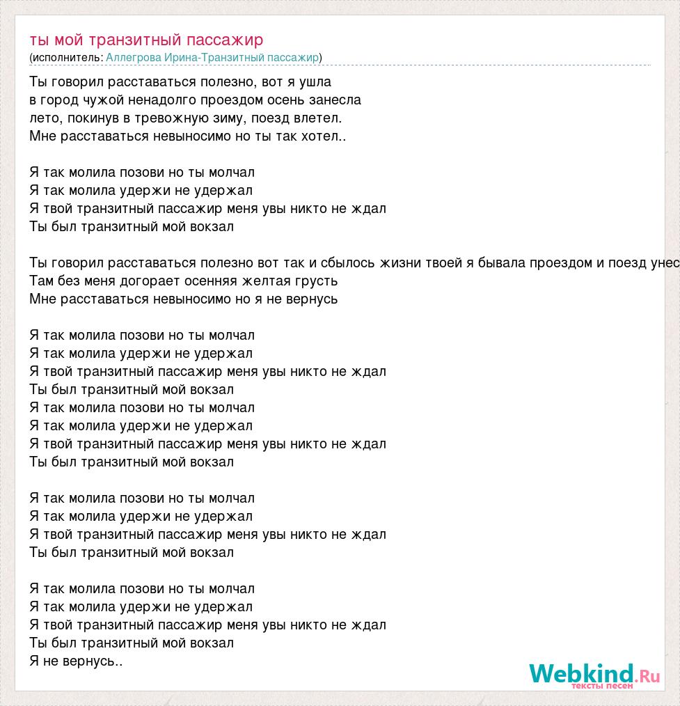 Ты говорил расставаться полезно, вот я ушла в город чужой ненадолго проездом осень занесла лето, покинув в тревожную зиму, поезд влетел. Мне расставаться невыносимо но ты так хотел.. Я так молила позови но ты молчал Я так молила удержи не удержал Я твой транзитный пассажир меня увы никто не ждал Ты был транзитный мой вокзал Ты говорил расставаться полезно вот так и сбылось жизни твоей я бывала проездом и поезд унес Там без меня догорает осенняя желтая грусть Мне расставаться невыносимо но я не вернусь Я так молила позови но ты молчал Я так молила удержи не удержал Я твой транзитный пассажир меня увы никто не ждал Ты был транзитный мой вокзал Я так молила позови но ты молчал Я так молила удержи не удержал Я твой транзитный пассажир меня увы никто не ждал Ты был транзитный мой вокзал Я так молила позови но ты молчал Я так молила удержи не удержал Я твой транзитный пассажир меня увы никто не ждал Ты был транзитный мой вокзал Я так молила позови но ты молчал Я так молила удержи не удержал Я твой транзитный пассажир меня увы никто не ждал Ты был транзитный мой вокзал Я не вернусь..