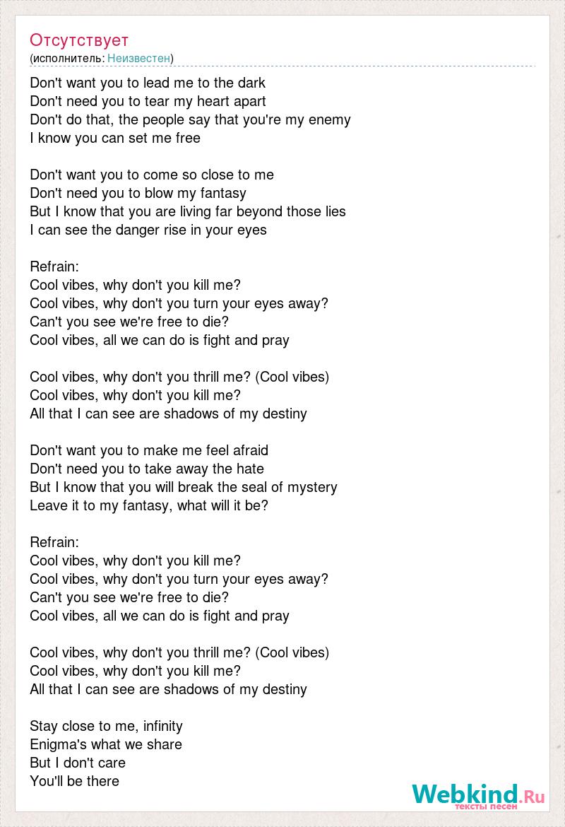 Don't want you to lead me to the dark Don't need you to tear my heart apart Don't do that, the people say that you're my enemy I know you can set me free Don't want you to come so close to me Don't need you to blow my fantasy But I know that you are living far beyond those lies I can see the danger rise in your eyes Refrain: Cool vibes, why don't you kill me? Cool vibes, why don't you turn your eyes away? Can't you see we're free to die? Cool vibes, all we can do is fight and pray Cool vibes, why don't you thrill me? (Cool vibes) Cool vibes, why don't you kill me? All that I can see are shadows of my destiny Don't want you to make me feel afraid Don't need you to take away the hate But I know that you will break the seal of mystery Leave it to my fantasy, what will it be? Refrain: Cool vibes, why don't you kill me? Cool vibes, why don't you turn your eyes away? Can't you see we're free to die? Cool vibes, all we can do is fight and pray Cool vibes, why don't you thrill me? (Cool vibes) Cool vibes, why don't you kill me? All that I can see are shadows of my destiny Stay close to me, infinity Enigma's what we share But I don't care You'll be there