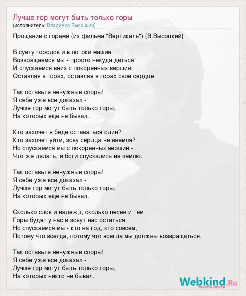 Прощание с горами (из фильма "Вертикаль") (В.Высоцкий) В суету городов и в потоки машин Возвращаемся мы - просто некуда деться! И спускаемся вниз с покоренных вершин, Оставляя в горах, оставляя в горах свое сердце. Так оставьте ненужные споры! Я себе уже все доказал - Лучше гор могут быть только горы, На которых еще не бывал. Кто захочет в беде оставаться один? Кто захочет уйти, зову сердца не внемля? Но спускаемся мы с покоренных вершин - Что же делать, и боги спускались на землю. Так оставьте ненужные споры! Я себе уже все доказал - Лучше гор могут быть только горы, На которых еще не бывал. Сколько слов и надежд, сколько песен и тем Горы будят у нас и зовут нас остаться. Но спускаемся мы - кто на год, кто совсем, Потому что всегда, потому что всегда мы должны возвращаться. Так оставьте ненужные споры! Я себе уже все доказал - Лучше гор могут быть только горы, На которых никто не бывал.