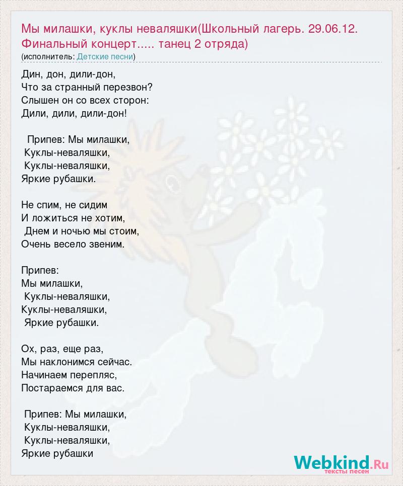 Дин, дон, дили-дон, Что за странный перезвон? Слышен он со всех сторон: Дили, дили, дили-дон! Припев: Мы милашки, Куклы-неваляшки, Куклы-неваляшки, Яркие рубашки. Не спим, не сидим И ложиться не хотим, Днем и ночью мы стоим, Очень весело звеним. Припев: Мы милашки, Куклы-неваляшки, Куклы-неваляшки, Яркие рубашки. Ох, раз, еще раз, Мы наклонимся сейчас. Начинаем перепляс, Постараемся для вас. Припев: Мы милашки, Куклы-неваляшки, Куклы-неваляшки, Яркие рубашки