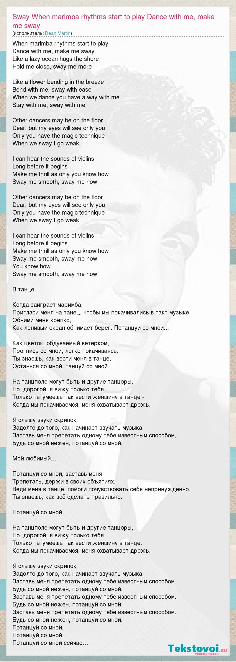 When marimba rhythms start to play Dance with me, make me sway Like a lazy ocean hugs the shore Hold me close, sway me more Like a flower bending in the breeze Bend with me, sway with ease When we dance you have a way with me Stay with me, sway with me Other dancers may be on the floor Dear, but my eyes will see only you Only you have the magic technique When we sway I go weak I can hear the sounds of violins Long before it begins Make me thrill as only you know how Sway me smooth, sway me now Other dancers may be on the floor Dear, but my eyes will see only you Only you have the magic technique When we sway I go weak I can hear the sounds of violins Long before it begins Make me thrill as only you know how Sway me smooth, sway me now You know how Sway me smooth, sway me now В танце Когда заиграет маримба, Пригласи меня на танец, чтобы мы покачивались в такт музыке. Обними меня крепко, Как ленивый океан обнимает берег. Потанцуй со мной... Как цветок, обдуваемый ветерком, Прогнись со мной, легко покачиваясь. Ты знаешь, как вести меня в танце, Останься со мной, танцуй со мной. На танцполе могут быть и другие танцоры, Но, дорогой, я вижу только тебя. Только ты умеешь так вести женщину в танце - Когда мы покачиваемся, меня охватывает дрожь. Я слышу звуки скрипок Задолго до того, как начинает звучать музыка. Заставь меня трепетать одному тебе известным способом, Будь со мной нежен, потанцуй со мной. Мой любимый… Потанцуй со мной, заставь меня Трепетать, держи в своих объятиях, Веди меня в танце, помоги почувствовать себя непринуждённо, Ты знаешь, как всё сделать правильно. Потанцуй со мной. На танцполе могут быть и другие танцоры, Но, дорогой, я вижу только тебя. Только ты умеешь так вести женщину в танце. Когда мы покачиваемся, меня охватывает дрожь. Я слышу звуки скрипок Задолго до того, как начинает звучать музыка. Заставь меня трепетать одному тебе известным способом. Будь со мной нежен, потанцуй со мной. Заставь меня трепетать одному тебе известным способом. Будь со мной нежен, потанцуй со мной. Заставь меня трепетать одному тебе известным способом. Будь со мной нежен, потанцуй со мной. Потанцуй со мной, Потанцуй со мной, Потанцуй со мной сейчас…
