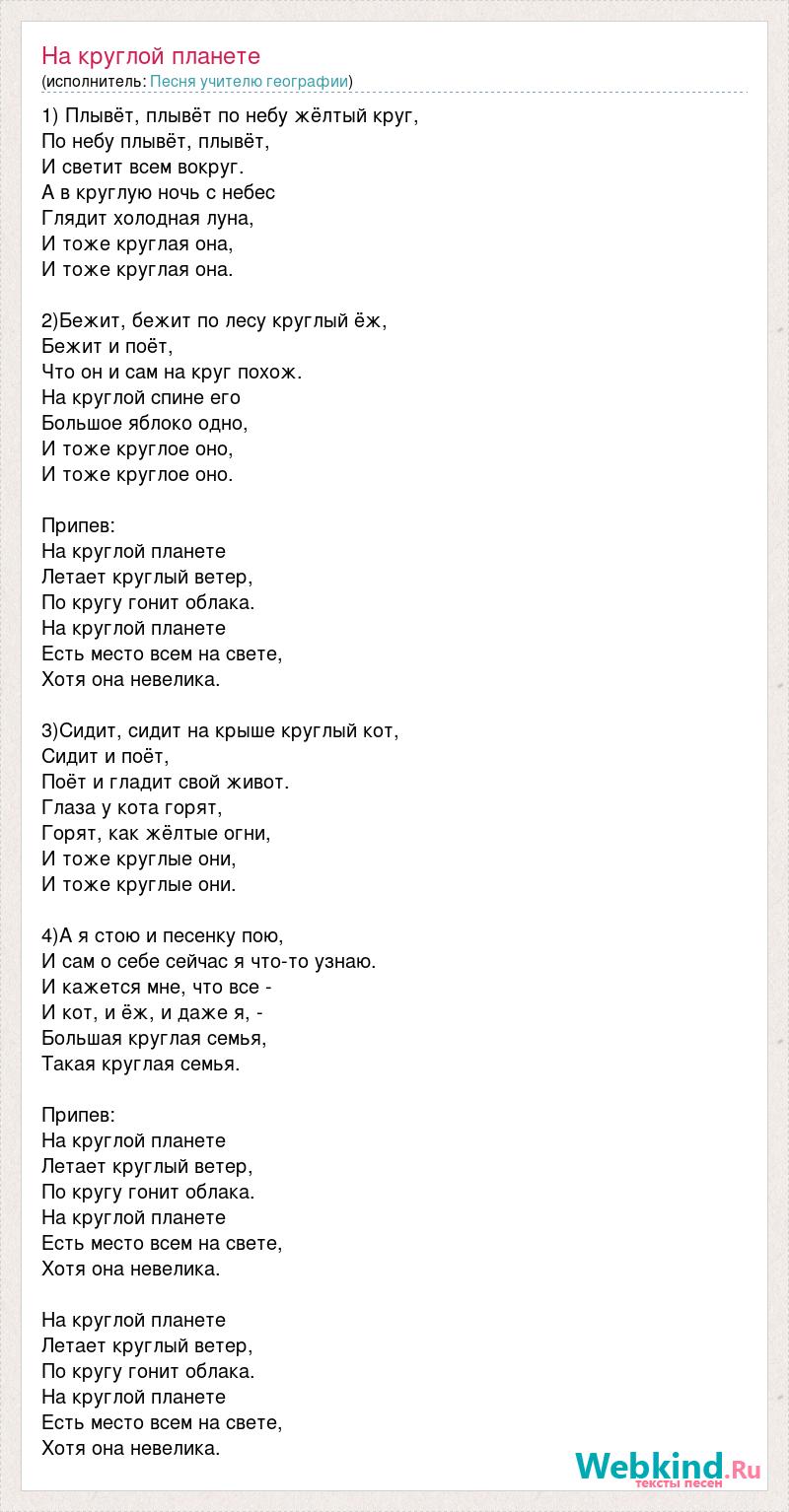 1) Плывёт, плывёт по небу жёлтый круг, По небу плывёт, плывёт, И светит всем вокруг. А в круглую ночь с небес Глядит холодная луна, И тоже круглая она, И тоже круглая она. 2)Бежит, бежит по лесу круглый ёж, Бежит и поёт, Что он и сам на круг похож. На круглой спине его Большое яблоко одно, И тоже круглое оно, И тоже круглое оно. Припев: На круглой планете Летает круглый ветер, По кругу гонит облака. На круглой планете Есть место всем на свете, Хотя она невелика. 3)Сидит, сидит на крыше круглый кот, Сидит и поёт, Поёт и гладит свой живот. Глаза у кота горят, Горят, как жёлтые огни, И тоже круглые они, И тоже круглые они. 4)А я стою и песенку пою, И сам о себе сейчас я что-то узнаю. И кажется мне, что все - И кот, и ёж, и даже я, - Большая круглая семья, Такая круглая семья. Припев: На круглой планете Летает круглый ветер, По кругу гонит облака. На круглой планете Есть место всем на свете, Хотя она невелика. На круглой планете Летает круглый ветер, По кругу гонит облака. На круглой планете Есть место всем на свете, Хотя она невелика.