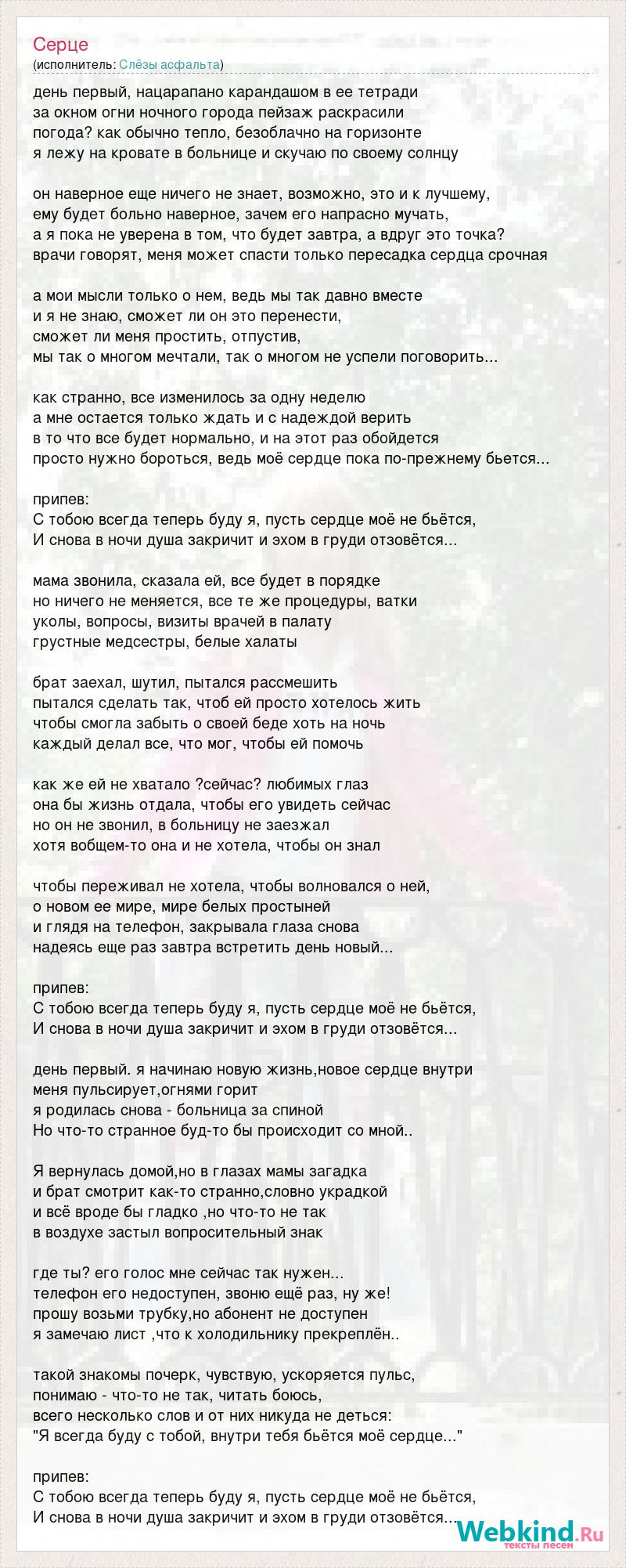 день первый, нацарапано карандашом в ее тетради за окном огни ночного города пейзаж раскрасили погода? как обычно тепло, безоблачно на горизонте я лежу на кровате в больнице и скучаю по своему солнцу он наверное еще ничего не знает, возможно, это и к лучшему, ему будет больно наверное, зачем его напрасно мучать, а я пока не уверена в том, что будет завтра, а вдруг это точка? врачи говорят, меня может спасти только пересадка сердца срочная а мои мысли только о нем, ведь мы так давно вместе и я не знаю, сможет ли он это перенести, сможет ли меня простить, отпустив, мы так о многом мечтали, так о многом не успели поговорить... как странно, все изменилось за одну неделю а мне остается только ждать и с надеждой верить в то что все будет нормально, и на этот раз обойдется просто нужно бороться, ведь моё сердце пока по-прежнему бьется... припев: С тобою всегда теперь буду я, пусть сердце моё не бьётся, И снова в ночи душа закричит и эхом в груди отзовётся... мама звонила, сказала ей, все будет в порядке но ничего не меняется, все те же процедуры, ватки уколы, вопросы, визиты врачей в палату грустные медсестры, белые халаты брат заехал, шутил, пытался рассмешить пытался сделать так, чтоб ей просто хотелось жить чтобы смогла забыть о своей беде хоть на ночь каждый делал все, что мог, чтобы ей помочь как же ей не хватало ?сейчас? любимых глаз она бы жизнь отдала, чтобы его увидеть сейчас но он не звонил, в больницу не заезжал хотя вобщем-то она и не хотела, чтобы он знал чтобы переживал не хотела, чтобы волновался о ней, о новом ее мире, мире белых простыней и глядя на телефон, закрывала глаза снова надеясь еще раз завтра встретить день новый... припев: С тобою всегда теперь буду я, пусть сердце моё не бьётся, И снова в ночи душа закричит и эхом в груди отзовётся... день первый. я начинаю новую жизнь,новое сердце внутри меня пульсирует,огнями горит я родилась снова - больница за спиной Но что-то странное буд-то бы происходит со мной.. Я вернулась домой,но в глазах мамы загадка и брат смотрит как-то странно,словно украдкой и всё вроде бы гладко ,но что-то не так в воздухе застыл вопросительный знак где ты? его голос мне сейчас так нужен... телефон его недоступен, звоню ещё раз, ну же! прошу возьми трубку,но абонент не доступен я замечаю лист ,что к холодильнику прекреплён.. такой знакомы почерк, чувствую, ускоряется пульс, понимаю - что-то не так, читать боюсь, всего несколько слов и от них никуда не деться: "Я всегда буду с тобой, внутри тебя бьётся моё сердце..." припев: С тобою всегда теперь буду я, пусть сердце моё не бьётся, И снова в ночи душа закричит и эхом в груди отзовётся...