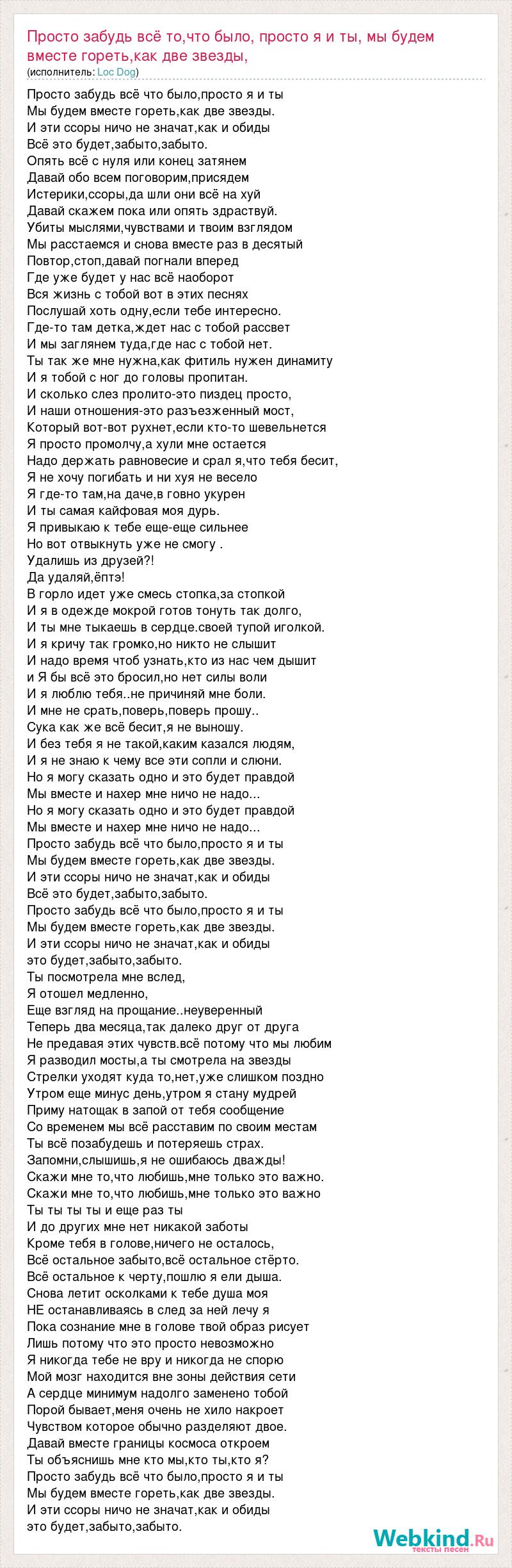 Просто забудь всё что было,просто я и ты Мы будем вместе гореть,как две звезды. И эти ссоры ничо не значат,как и обиды Всё это будет,забыто,забыто. Опять всё с нуля или конец затянем Давай обо всем поговорим,присядем Истерики,ссоры,да шли они всё на хуй Давай скажем пока или опять здраствуй. Убиты мыслями,чувствами и твоим взглядом Мы расстаемся и снова вместе раз в десятый Повтор,стоп,давай погнали вперед Где уже будет у нас всё наоборот Вся жизнь с тобой вот в этих песнях Послушай хоть одну,если тебе интересно. Где-то там детка,ждет нас с тобой рассвет И мы заглянем туда,где нас с тобой нет. Ты так же мне нужна,как фитиль нужен динамиту И я тобой с ног до головы пропитан. И сколько слез пролито-это пиздец просто, И наши отношения-это разъезженный мост, Который вот-вот рухнет,если кто-то шевельнется Я просто промолчу,а хули мне остается Надо держать равновесие и срал я,что тебя бесит, Я не хочу погибать и ни хуя не весело Я где-то там,на даче,в говно укурен И ты самая кайфовая моя дурь. Я привыкаю к тебе еще-еще сильнее Но вот отвыкнуть уже не смогу . Удалишь из друзей?! Да удаляй,ёптэ! В горло идет уже смесь стопка,за стопкой И я в одежде мокрой готов тонуть так долго, И ты мне тыкаешь в сердце.своей тупой иголкой. И я кричу так громко,но никто не слышит И надо время чтоб узнать,кто из нас чем дышит и Я бы всё это бросил,но нет силы воли И я люблю тебя..не причиняй мне боли. И мне не срать,поверь,поверь прошу.. Сука как же всё бесит,я не выношу. И без тебя я не такой,каким казался людям, И я не знаю к чему все эти сопли и слюни. Но я могу сказать одно и это будет правдой Мы вместе и нахер мне ничо не надо... Но я могу сказать одно и это будет правдой Мы вместе и нахер мне ничо не надо... Просто забудь всё что было,просто я и ты Мы будем вместе гореть,как две звезды. И эти ссоры ничо не значат,как и обиды Всё это будет,забыто,забыто. Просто забудь всё что было,просто я и ты Мы будем вместе гореть,как две звезды. И эти ссоры ничо не значат,как и обиды это будет,забыто,забыто. Ты посмотрела мне вслед, Я отошел медленно, Еще взгляд на прощание..неуверенный Теперь два месяца,так далеко друг от друга Не предавая этих чувств.всё потому что мы любим Я разводил мосты,а ты смотрела на звезды Стрелки уходят куда то,нет,уже слишком поздно Утром еще минус день,утром я стану мудрей Приму натощак в запой от тебя сообщение Со временем мы всё расставим по своим местам Ты всё позабудешь и потеряешь страх. Запомни,слышишь,я не ошибаюсь дважды! Скажи мне то,что любишь,мне только это важно. Скажи мне то,что любишь,мне только это важно Ты ты ты ты и еще раз ты И до других мне нет никакой заботы Кроме тебя в голове,ничего не осталось, Всё остальное забыто,всё остальное стёрто. Всё остальное к черту,пошлю я ели дыша. Снова летит осколками к тебе душа моя НЕ останавливаясь в след за ней лечу я Пока сознание мне в голове твой образ рисует Лишь потому что это просто невозможно Я никогда тебе не вру и никогда не спорю Мой мозг находится вне зоны действия сети А сердце минимум надолго заменено тобой Порой бывает,меня очень не хило накроет Чувством которое обычно разделяют двое. Давай вместе границы космоса откроем Ты объяснишь мне кто мы,кто ты,кто я? Просто забудь всё что было,просто я и ты Мы будем вместе гореть,как две звезды. И эти ссоры ничо не значат,как и обиды это будет,забыто,забыто.