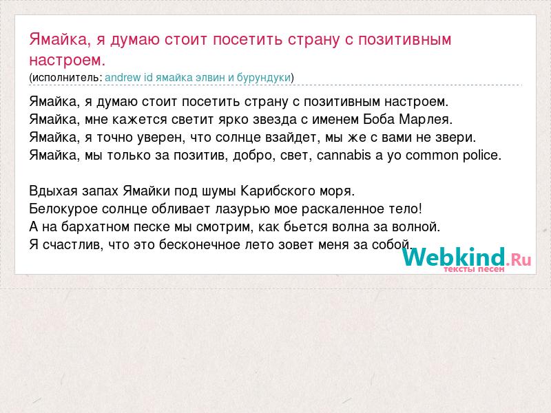 А как ты думаешь, о чем песня "Ямайка, я думаю стоит посетить страну с позитивным настроем. Ямайка, мн" ?