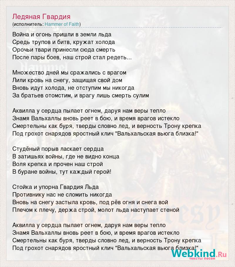 Война и огонь пришли в земли льда Средь трупов и битв, кружат холода Орочьи твари принесли сюда смерть После пары боев, наш строй стал редеть... Множество дней мы сражались с врагом Лили кровь на снегу, защищая свой дом Вновь идут холода, не отступим мы никогда За братьев отомстим, и врагу лишь смерть сулим Аквилла у сердца пылает огнем, даруя нам веры тепло Знамя Вальхаллы вновь реет в бою, и время врагов истекло Смертельны как буря, тверды словно лед, и верность Трону крепка Под грохот снарядов яростный клич "Вальхальская вьюга близка!" Студёный порыв ласкает сердца В затишьях войны, где не видно конца Воля крепка и прочен наш строй В буране войны, тут каждый герой! Стойка и упорна Гвардия Льда Противнику нас не сломить никогда Вновь на снегу застыла кровь, под рёв огня и снега вой Плечом к плечу, держа строй, молот льда наступает стеной Аквилла у сердца пылает огнем, даруя нам веры тепло Знамя Вальхаллы вновь реет в бою, и время врагов истекло Смертельны как буря, тверды словно лед, и верность Трону крепка Под грохот снарядов яростный клич "Вальхальская вьюга близка!"
