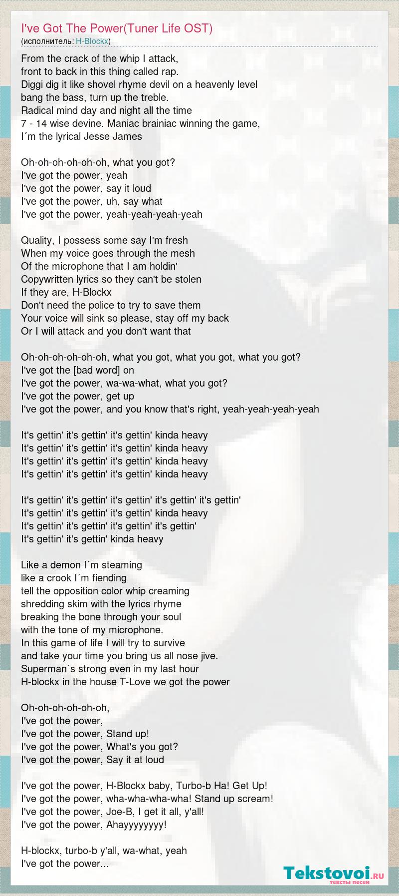 From the crack of the whip I attack, front to back in this thing called rap. Diggi dig it like shovel rhyme devil on a heavenly level bang the bass, turn up the treble. Radical mind day and night all the time 7 - 14 wise devine. Maniac brainiac winning the game, I´m the lyrical Jesse James Oh-oh-oh-oh-oh-oh, what you got? I've got the power, yeah I've got the power, say it loud I've got the power, uh, say what I've got the power, yeah-yeah-yeah-yeah Quality, I possess some say I'm fresh When my voice goes through the mesh Of the microphone that I am holdin' Copywritten lyrics so they can't be stolen If they are, H-Blockx Don't need the police to try to save them Your voice will sink so please, stay off my back Or I will attack and you don't want that Oh-oh-oh-oh-oh-oh, what you got, what you got, what you got? I've got the power, come on I've got the power, wa-wa-what, what you got? I've got the power, get up I've got the power, and you know that's right, yeah-yeah-yeah-yeah It's gettin' it's gettin' it's gettin' kinda heavy It's gettin' it's gettin' it's gettin' kinda heavy It's gettin' it's gettin' it's gettin' kinda heavy It's gettin' it's gettin' it's gettin' kinda heavy It's gettin' it's gettin' it's gettin' it's gettin' it's gettin' It's gettin' it's gettin' it's gettin' kinda heavy It's gettin' it's gettin' it's gettin' it's gettin' It's gettin' it's gettin' kinda heavy Like a demon I´m steaming like a crook I´m fiending tell the opposition color whip creaming shredding skim with the lyrics rhyme breaking the bone through your soul with the tone of my microphone. In this game of life I will try to survive and take your time you bring us all nose jive. Superman´s strong even in my last hour H-blockx in the house T-Love we got the power Oh-oh-oh-oh-oh-oh, I've got the power, I've got the power, Stand up! I've got the power, What's you got? I've got the power, Say it at loud I've got the power, H-Blockx baby, Turbo-b Ha! Get Up! I've got the power, wha-wha-wha-wha! Stand up scream! I've got the power, Joe-B, I get it all, y'all! I've got the power, Ahayyyyyyyy! H-blockx, turbo-b y'all, wa-what, yeah I've got the power...