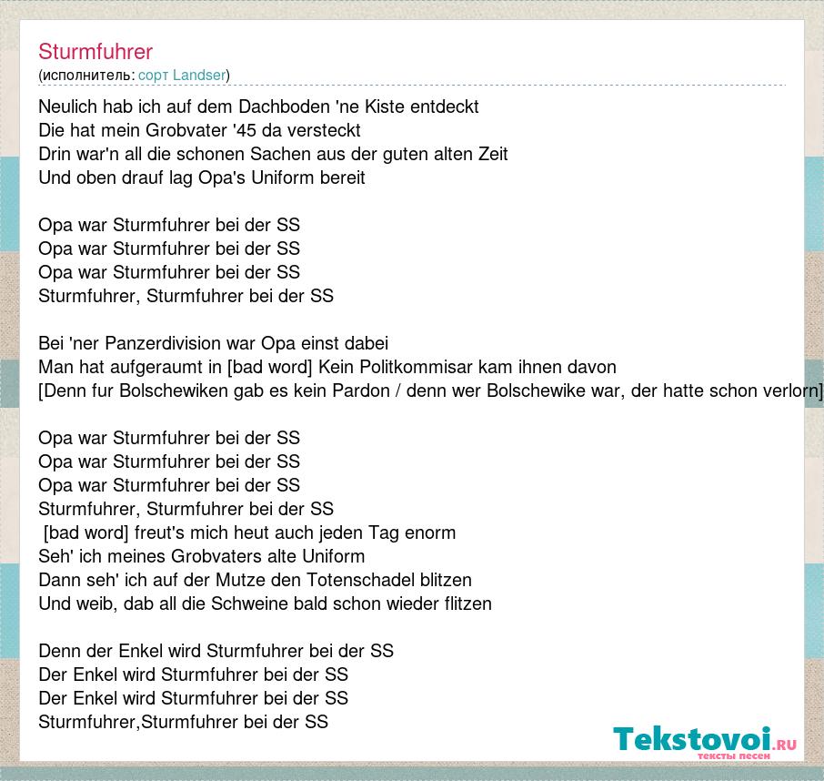 Neulich hab ich auf dem Dachboden 'ne Kiste entdeckt Die hat mein Grobvater '45 da versteckt Drin war'n all die schonen Sachen aus der guten alten Zeit Und oben drauf lag Opa's Uniform bereit Opa war Sturmfuhrer bei der SS Opa war Sturmfuhrer bei der SS Opa war Sturmfuhrer bei der SS Sturmfuhrer, Sturmfuhrer bei der SS Bei 'ner Panzerdivision war Opa einst dabei Man hat aufgeraumt in der Russerei Kein Politkommisar kam ihnen davon [Denn fur Bolschewiken gab es kein Pardon / denn wer Bolschewike war, der hatte schon verlorn] Opa war Sturmfuhrer bei der SS Opa war Sturmfuhrer bei der SS Opa war Sturmfuhrer bei der SS Sturmfuhrer, Sturmfuhrer bei der SS Drum freut's mich heut auch jeden Tag enorm Seh' ich meines Grobvaters alte Uniform Dann seh' ich auf der Mutze den Totenschadel blitzen Und weib, dab all die Schweine bald schon wieder flitzen Denn der Enkel wird Sturmfuhrer bei der SS Der Enkel wird Sturmfuhrer bei der SS Der Enkel wird Sturmfuhrer bei der SS Sturmfuhrer,Sturmfuhrer bei der SS