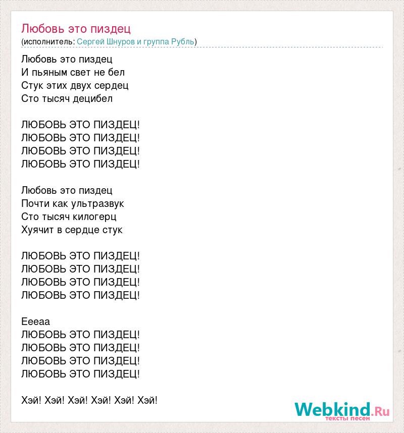 Любовь это пиздец И пьяным свет не бел Стук этих двух сердец Сто тысяч децибел ЛЮБОВЬ ЭТО ПИЗДЕЦ! ЛЮБОВЬ ЭТО ПИЗДЕЦ! ЛЮБОВЬ ЭТО ПИЗДЕЦ! ЛЮБОВЬ ЭТО ПИЗДЕЦ! Любовь это пиздец Почти как ультразвук Сто тысяч килогерц Хуячит в сердце стук ЛЮБОВЬ ЭТО ПИЗДЕЦ! ЛЮБОВЬ ЭТО ПИЗДЕЦ! ЛЮБОВЬ ЭТО ПИЗДЕЦ! ЛЮБОВЬ ЭТО ПИЗДЕЦ! Еееаа ЛЮБОВЬ ЭТО ПИЗДЕЦ! ЛЮБОВЬ ЭТО ПИЗДЕЦ! ЛЮБОВЬ ЭТО ПИЗДЕЦ! ЛЮБОВЬ ЭТО ПИЗДЕЦ! Хэй! Хэй! Хэй! Хэй! Хэй! Хэй!