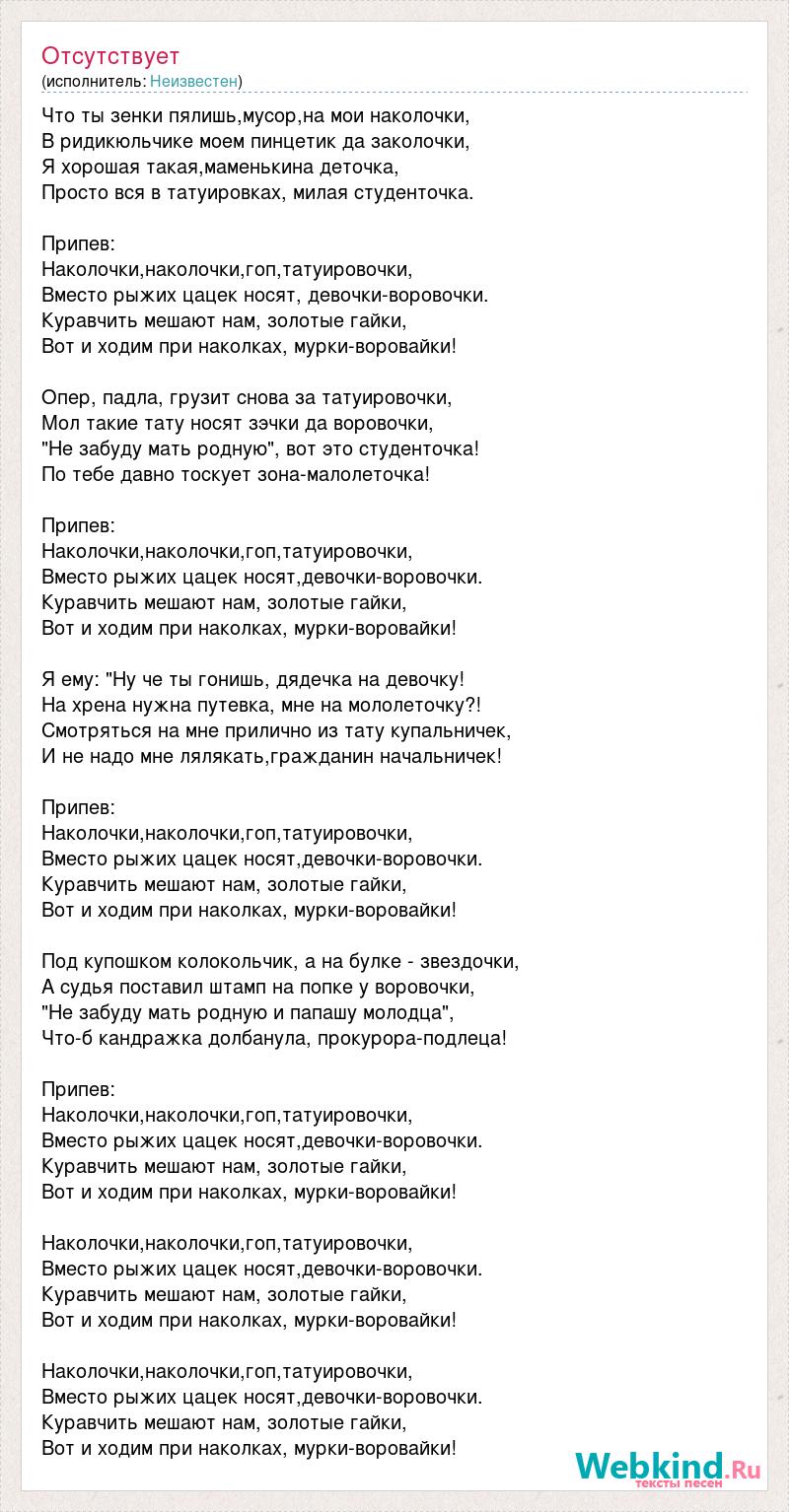 Что ты зенки пялишь,мусор,на мои наколочки, В ридикюльчике моем пинцетик да заколочки, Я хорошая такая,маменькина деточка, Просто вся в татуировках, милая студенточка. Припев: Наколочки,наколочки,гоп,татуировочки, Вместо рыжих цацек носят, девочки-воровочки. Куравчить мешают нам, золотые гайки, Вот и ходим при наколках, мурки-воровайки! Опер, падла, грузит снова за татуировочки, Мол такие тату носят зэчки да воровочки, "Не забуду мать родную", вот это студенточка! По тебе давно тоскует зона-малолеточка! Припев: Наколочки,наколочки,гоп,татуировочки, Вместо рыжих цацек носят,девочки-воровочки. Куравчить мешают нам, золотые гайки, Вот и ходим при наколках, мурки-воровайки! Я ему: "Ну че ты гонишь, дядечка на девочку! На хрена нужна путевка, мне на мололеточку?! Смотряться на мне прилично из тату купальничек, И не надо мне лялякать,гражданин начальничек! Припев: Наколочки,наколочки,гоп,татуировочки, Вместо рыжих цацек носят,девочки-воровочки. Куравчить мешают нам, золотые гайки, Вот и ходим при наколках, мурки-воровайки! Под купошком колокольчик, а на булке - звездочки, А судья поставил штамп на попке у воровочки, "Не забуду мать родную и папашу молодца", Что-б кандражка долбанула, прокурора-подлеца! Припев: Наколочки,наколочки,гоп,татуировочки, Вместо рыжих цацек носят,девочки-воровочки. Куравчить мешают нам, золотые гайки, Вот и ходим при наколках, мурки-воровайки! Наколочки,наколочки,гоп,татуировочки, Вместо рыжих цацек носят,девочки-воровочки. Куравчить мешают нам, золотые гайки, Вот и ходим при наколках, мурки-воровайки! Наколочки,наколочки,гоп,татуировочки, Вместо рыжих цацек носят,девочки-воровочки. Куравчить мешают нам, золотые гайки, Вот и ходим при наколках, мурки-воровайки!
