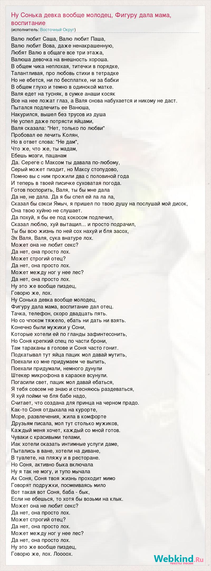 Главная→Исполнители→Восточный Округ→Ну Сонька девка вообще молодец, Фигуру дала мама, воспитание дал отец.