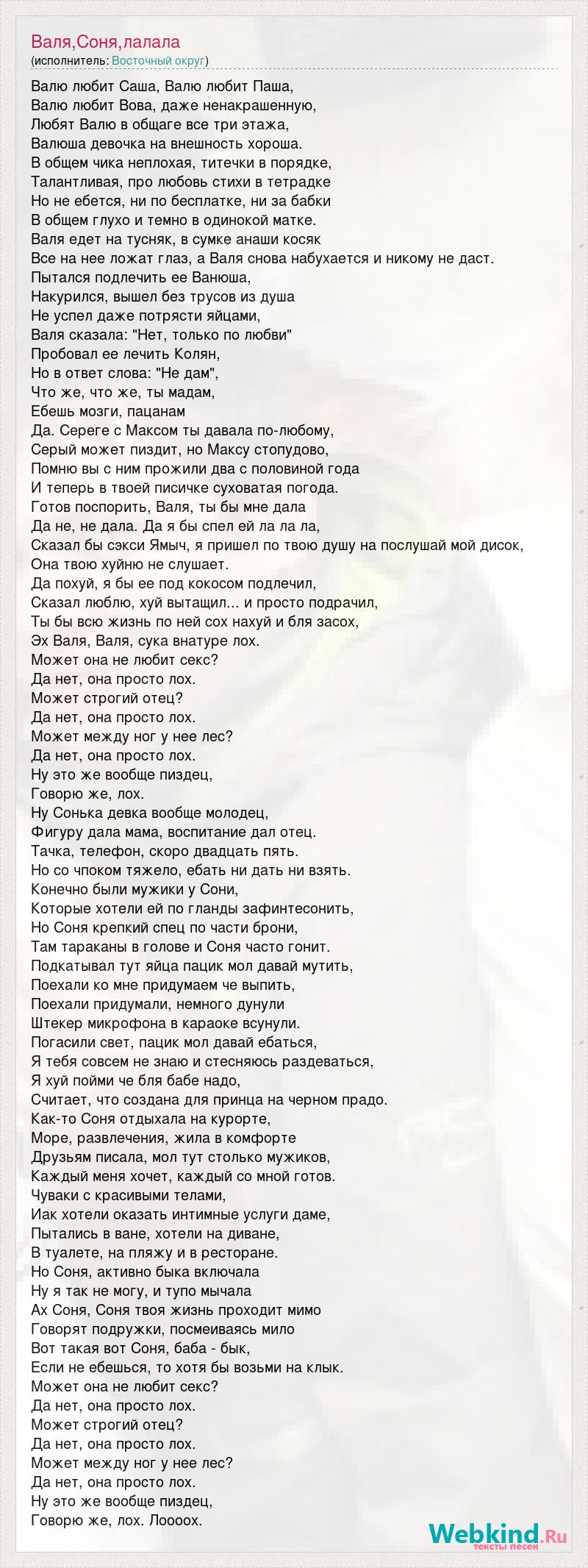 Валю любит Саша, Валю любит Паша, Валю любит Вова, даже ненакрашенную, Любят Валю в общаге все три этажа, Валюша девочка на внешность хороша. В общем чика неплохая, титечки в порядке, Талантливая, про любовь стихи в тетрадке Но не ебется, ни по бесплатке, ни за бабки В общем глухо и темно в одинокой матке. Валя едет на тусняк, в сумке анаши косяк Все на нее ложат глаз, а Валя снова набухается и никому не даст. Пытался подлечить ее Ванюша, Накурился, вышел без трусов из душа Не успел даже потрясти яйцами, Валя сказала: "Нет, только по любви" Пробовал ее лечить Колян, Но в ответ слова: "Не дам", Что же, что же, ты мадам, Ебешь мозги, пацанам Да. Сереге с Максом ты давала по-любому, Серый может пиздит, но Максу стопудово, Помню вы с ним прожили два с половиной года И теперь в твоей писичке суховатая погода. Готов поспорить, Валя, ты бы мне дала Да не, не дала. Да я бы спел ей ла ла ла, Сказал бы сэкси Ямыч, я пришел по твою душу на послушай мой дисок, Она твою хуйню не слушает. Да похуй, я бы ее под кокосом подлечил, Сказал люблю, хуй вытащил... и просто подрачил, Ты бы всю жизнь по ней сох нахуй и бля засох, Эх Валя, Валя, сука внатуре лох. Может она не любит секс? Да нет, она просто лох. Может строгий отец? Да нет, она просто лох. Может между ног у нее лес? Да нет, она просто лох. Ну это же вообще пиздец, Говорю же, лох. Ну Сонька девка вообще молодец, Фигуру дала мама, воспитание дал отец. Тачка, телефон, скоро двадцать пять. Но со чпоком тяжело, ебать ни дать ни взять. Конечно были мужики у Сони, Которые хотели ей по гланды зафинтесонить, Но Соня крепкий спец по части брони, Там тараканы в голове и Соня часто гонит. Подкатывал тут яйца пацик мол давай мутить, Поехали ко мне придумаем че выпить, Поехали придумали, немного дунули Штекер микрофона в караоке всунули. Погасили свет, пацик мол давай ебаться, Я тебя совсем не знаю и стесняюсь раздеваться, Я хуй пойми че бля бабе надо, Считает, что создана для принца на черном прадо. Как-то Соня отдыхала на курорте, Море, развлечения, жила в комфорте Друзьям писала, мол тут столько мужиков, Каждый меня хочет, каждый со мной готов. Чуваки с красивыми телами, Иак хотели оказать интимные услуги даме, Пытались в ване, хотели на диване, В туалете, на пляжу и в ресторане. Но Соня, активно быка включала Ну я так не могу, и тупо мычала Ах Соня, Соня твоя жизнь проходит мимо Говорят подружки, посмеиваясь мило Вот такая вот Соня, баба - бык, Если не ебешься, то хотя бы возьми на клык. Может она не любит секс? Да нет, она просто лох. Может строгий отец? Да нет, она просто лох. Может между ног у нее лес? Да нет, она просто лох. Ну это же вообще пиздец, Говорю же, лох. Лоооох.