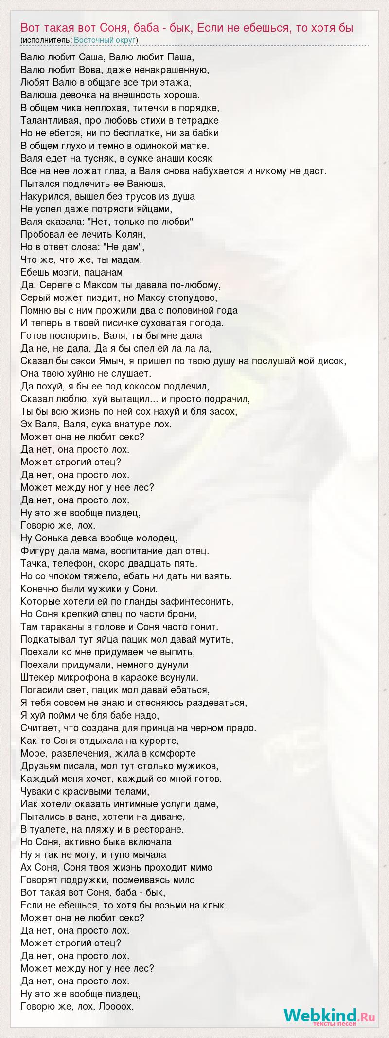 Главная→Исполнители→Восточный Округ→Вот такая вот Соня, баба - бык, Если не ебешься, то хотя бы возьми на