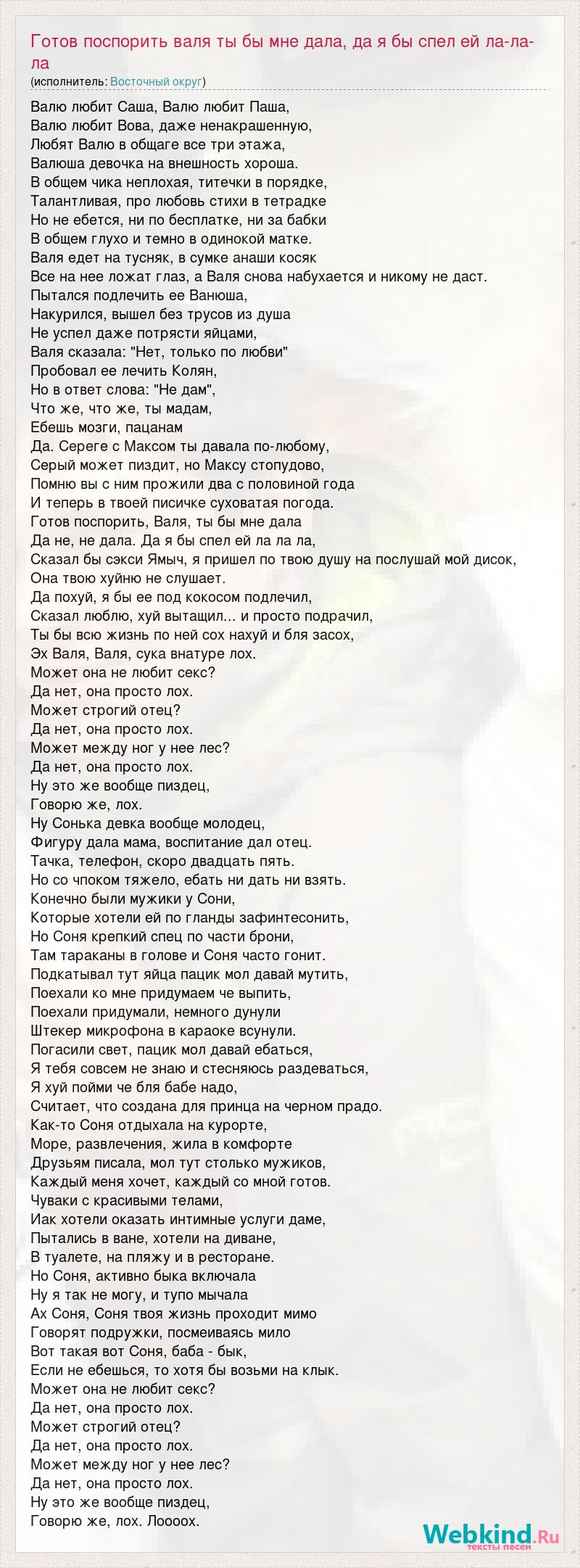 Валю любит Саша, Валю любит Паша, Валю любит Вова, даже ненакрашенную, Любят Валю в общаге все три этажа, Валюша девочка на внешность хороша. В общем чика неплохая, титечки в порядке, Талантливая, про любовь стихи в тетрадке Но не ебется, ни по бесплатке, ни за бабки В общем глухо и темно в одинокой матке. Валя едет на тусняк, в сумке анаши косяк Все на нее ложат глаз, а Валя снова набухается и никому не даст. Пытался подлечить ее Ванюша, Накурился, вышел без трусов из душа Не успел даже потрясти яйцами, Валя сказала: "Нет, только по любви" Пробовал ее лечить Колян, Но в ответ слова: "Не дам", Что же, что же, ты мадам, Ебешь мозги, пацанам Да. Сереге с Максом ты давала по-любому, Серый может пиздит, но Максу стопудово, Помню вы с ним прожили два с половиной года И теперь в твоей писичке суховатая погода. Готов поспорить, Валя, ты бы мне дала Да не, не дала. Да я бы спел ей ла ла ла, Сказал бы сэкси Ямыч, я пришел по твою душу на послушай мой дисок, Она твою хуйню не слушает. Да похуй, я бы ее под кокосом подлечил, Сказал люблю, хуй вытащил... и просто подрачил, Ты бы всю жизнь по ней сох нахуй и бля засох, Эх Валя, Валя, сука внатуре лох. Может она не любит секс? Да нет, она просто лох. Может строгий отец? Да нет, она просто лох. Может между ног у нее лес? Да нет, она просто лох. Ну это же вообще пиздец, Говорю же, лох. Ну Сонька девка вообще молодец, Фигуру дала мама, воспитание дал отец. Тачка, телефон, скоро двадцать пять. Но со чпоком тяжело, ебать ни дать ни взять. Конечно были мужики у Сони, Которые хотели ей по гланды зафинтесонить, Но Соня крепкий спец по части брони, Там тараканы в голове и Соня часто гонит. Подкатывал тут яйца пацик мол давай мутить, Поехали ко мне придумаем че выпить, Поехали придумали, немного дунули Штекер микрофона в караоке всунули. Погасили свет, пацик мол давай ебаться, Я тебя совсем не знаю и стесняюсь раздеваться, Я хуй пойми че бля бабе надо, Считает, что создана для принца на черном прадо. Как-то Соня отдыхала на курорте, Море, развлечения, жила в комфорте Друзьям писала, мол тут столько мужиков, Каждый меня хочет, каждый со мной готов. Чуваки с красивыми телами, Иак хотели оказать интимные услуги даме, Пытались в ване, хотели на диване, В туалете, на пляжу и в ресторане. Но Соня, активно быка включала Ну я так не могу, и тупо мычала Ах Соня, Соня твоя жизнь проходит мимо Говорят подружки, посмеиваясь мило Вот такая вот Соня, баба - бык, Если не ебешься, то хотя бы возьми на клык. Может она не любит секс? Да нет, она просто лох. Может строгий отец? Да нет, она просто лох. Может между ног у нее лес? Да нет, она просто лох. Ну это же вообще пиздец, Говорю же, лох. Лоооох.